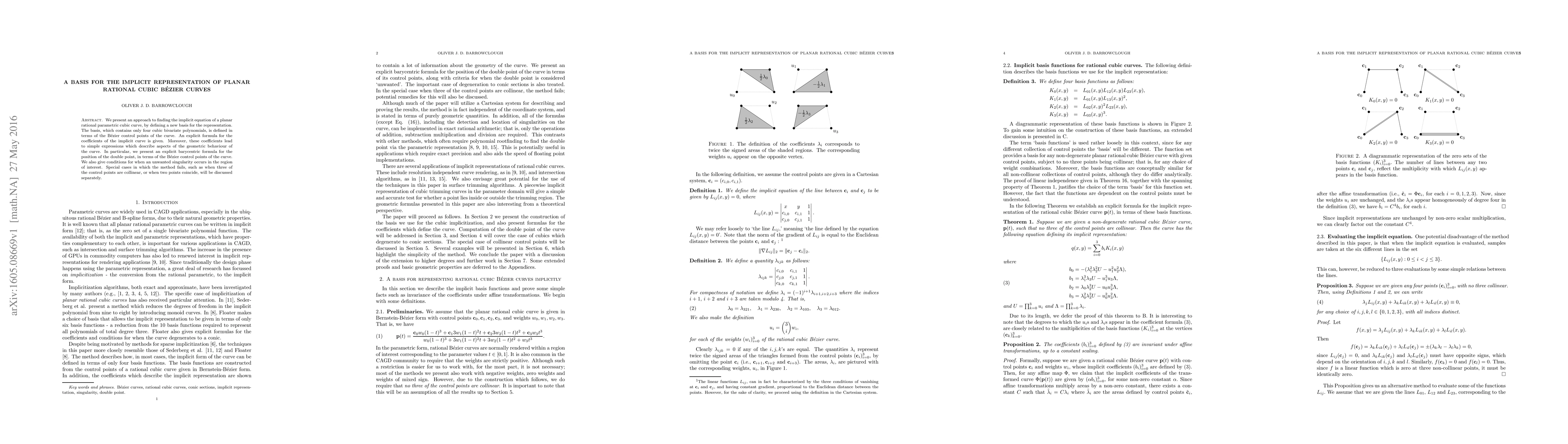 We present an approach to finding the implicit equation of a planar rational parametric cubic curve, by defining a new basis for the representation. The basis, which contains only four cubic bivariate polynomials, is defined in terms of the B\'ezier control points of the curve. An explicit formula for the coefficients of the implicit curve is given. Moreover, these coefficients lead to simple expressions which describe aspects of the geometric behaviour of the curve. In particular, we present an explicit barycentric formula for the position of the double point, in terms of the B\'ezier control points of the curve. We also give conditions for when an unwanted singularity occurs in the region of interest. Special cases in which the method fails, such as when three of the control points are collinear, or when two points coincide, will be discussed separately.