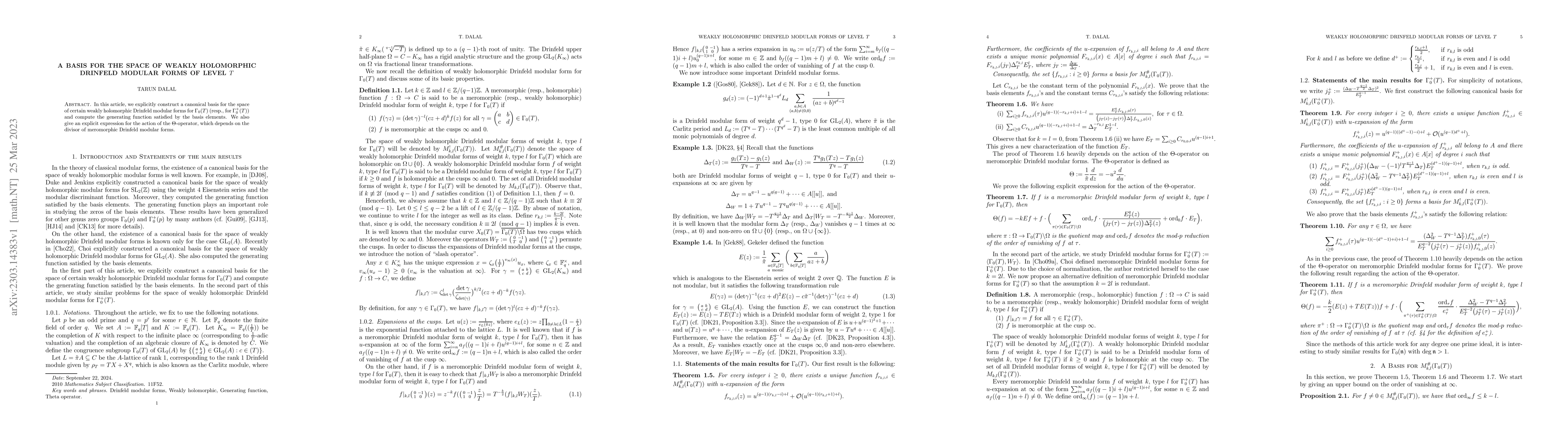 This paper constructs a canonical basis for weakly holomorphic Drinfeld modular forms of level $T$ and computes their generating function, while also providing an explicit expression for the action of the $\Theta$-operator associated with the divisor of meromorphic Drinfeld modular forms.