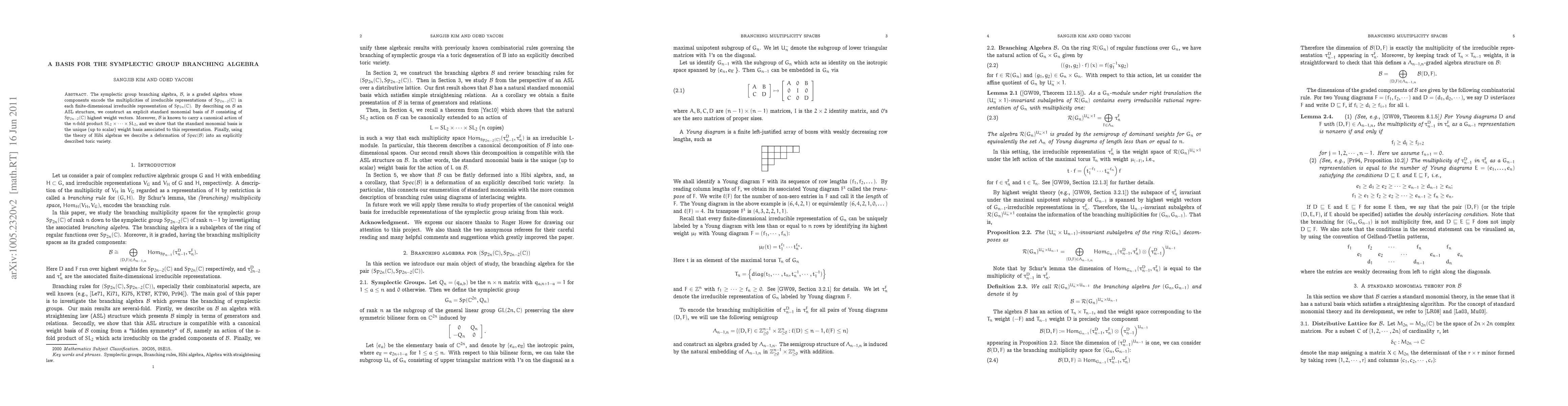 This paper constructs an explicit standard monomial basis for the symplectic group branching algebra B, which encodes multiplicities of irreducible representations. It demonstrates B's unique weight basis under the action of the n-fold product SL(2) and uses Hibi algebras to describe a deformation of Spec(B) into a toric variety.