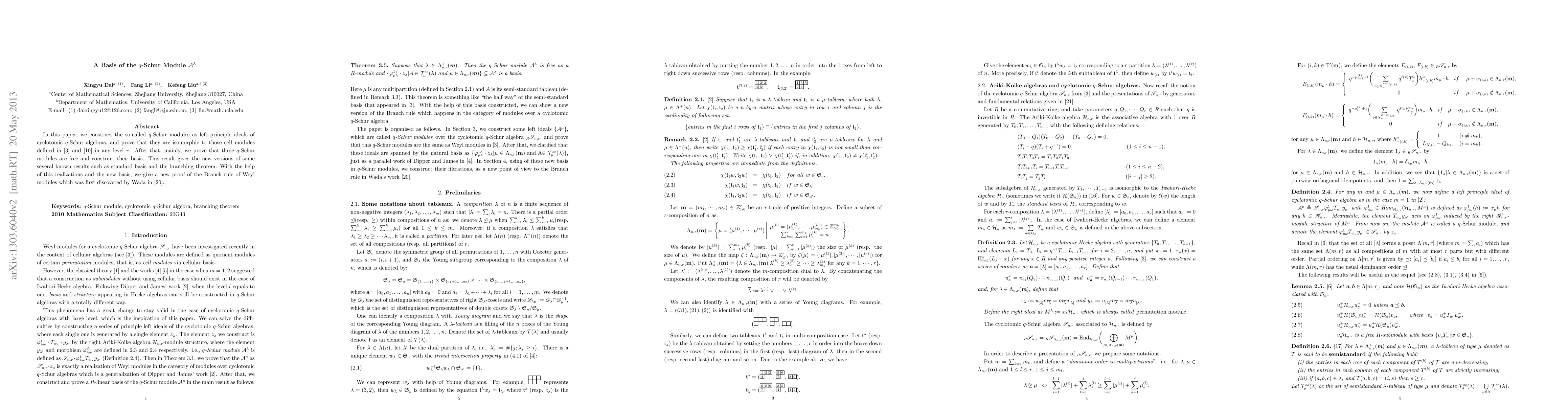 In this paper, we construct the $q$-Schur modules as left principle ideals of the cyclotomic $q$-Schur algebras, and prove that they are isomorphic to those cell modules defined in \cite{8} and \cite{15} at any level $r$. Then we prove that these $q$-Schur modules are free modules and construct their bases. This result gives us new versions of several results about the standard basis and the branching theorem. With the help of such realizations and the new bases, we re-prove the Branch rule of Weyl modules which was first discovered and proved by Wada in \cite{23}.