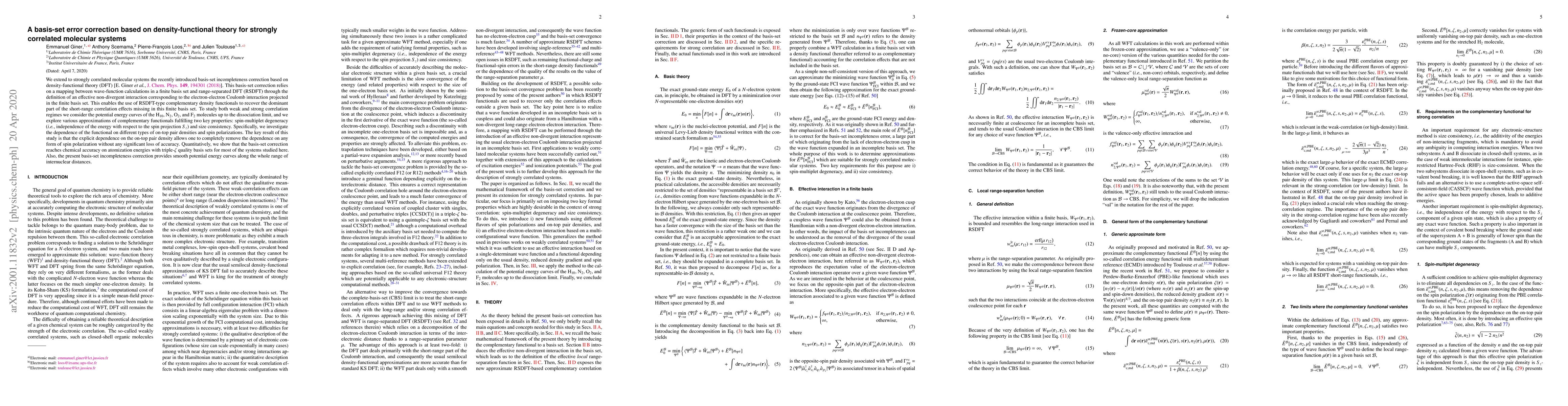 This paper proposes a basis-set correction method based on density-functional theory (DFT) to address basis-set incompleteness in strongly correlated molecular systems. The method uses range-separated DFT to recover short-range correlation effects, achieving chemical accuracy on atomization energies and providing smooth potential energy curves.