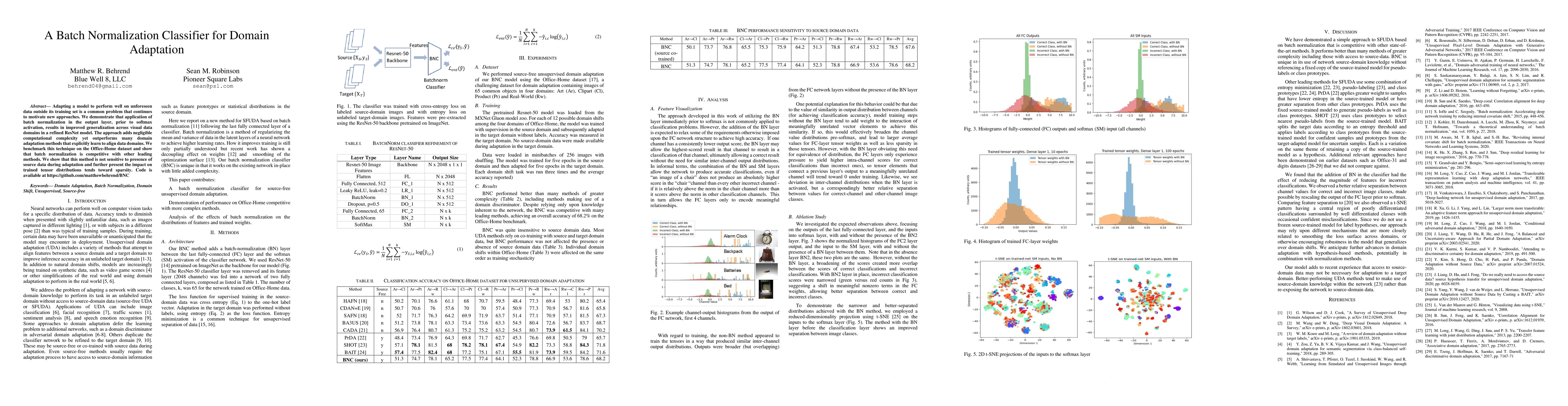 Adapting a model to perform well on unforeseen data outside its training set is a common problem that continues to motivate new approaches. We demonstrate that application of batch normalization in the output layer, prior to softmax activation, results in improved generalization across visual data domains in a refined ResNet model. The approach adds negligible computational complexity yet outperforms many domain adaptation methods that explicitly learn to align data domains. We benchmark this technique on the Office-Home dataset and show that batch normalization is competitive with other leading methods. We show that this method is not sensitive to presence of source data during adaptation and further present the impact on trained tensor distributions tends toward sparsity. Code is available at https://github.com/matthewbehrend/BNC