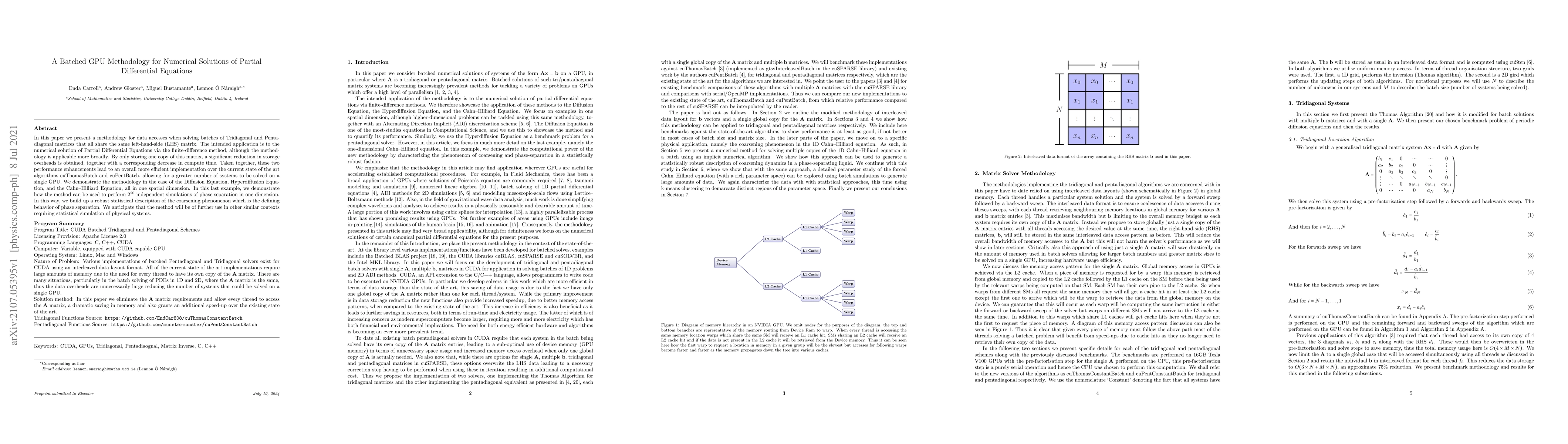 In this paper we present a methodology for data accesses when solving batches of Tridiagonal and Pentadiagonal matrices that all share the same left-hand-side (LHS) matrix. The intended application is to the numerical solution of Partial Differential Equations via the finite-difference method, although the methodology is applicable more broadly. By only storing one copy of this matrix, a significant reduction in storage overheads is obtained, together with a corresponding decrease in compute time. Taken together, these two performance enhancements lead to an overall more efficient implementation over the current state of the art algorithms cuThomasBatch and cuPentBatch, allowing for a greater number of systems to be solved on a single GPU. We demonstrate the methodology in the case of the Diffusion Equation, Hyperdiffusion Equation, and the Cahn--Hilliard Equation, all in one spatial dimension. In this last example, we demonstrate how the method can be used to perform $2^{20}$ independent simulations of phase separation in one dimension. In this way, we build up a robust statistical description of the coarsening phenomenon which is the defining behavior of phase separation. We anticipate that the method will be of further use in other similar contexts requiring statistical simulation of physical systems.