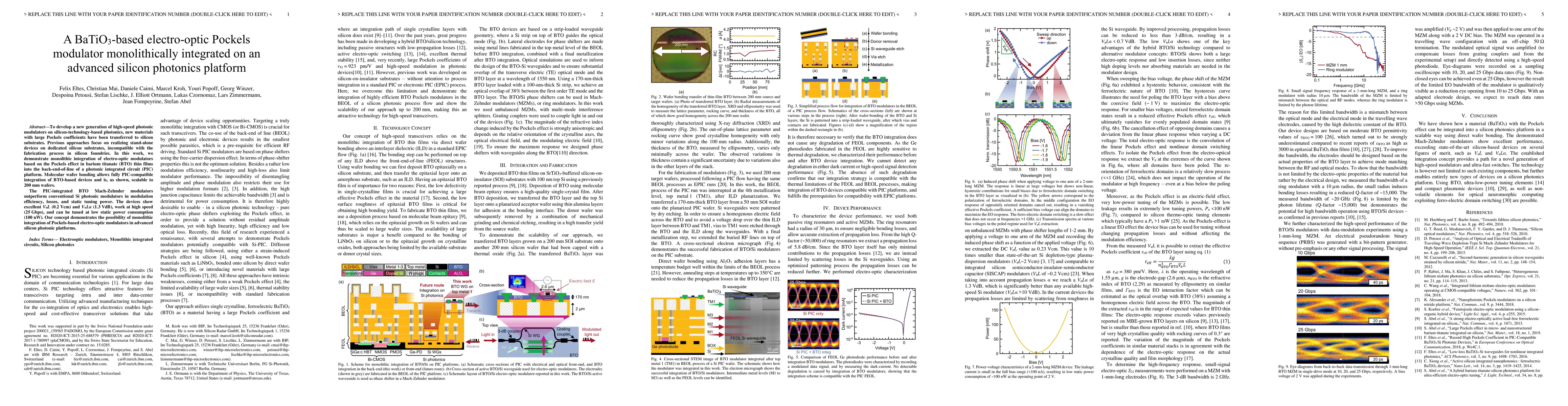 This paper presents the monolithic integration of barium titanate (BaTiO3)-based electro-optic modulators on a silicon photonics platform using molecular wafer bonding, achieving high-speed modulation (25 Gbps) and low static power consumption (100 nW). The integrated BTO Mach-Zehnder modulators outperform conventional silicon photonic modulators in efficiency and losses.