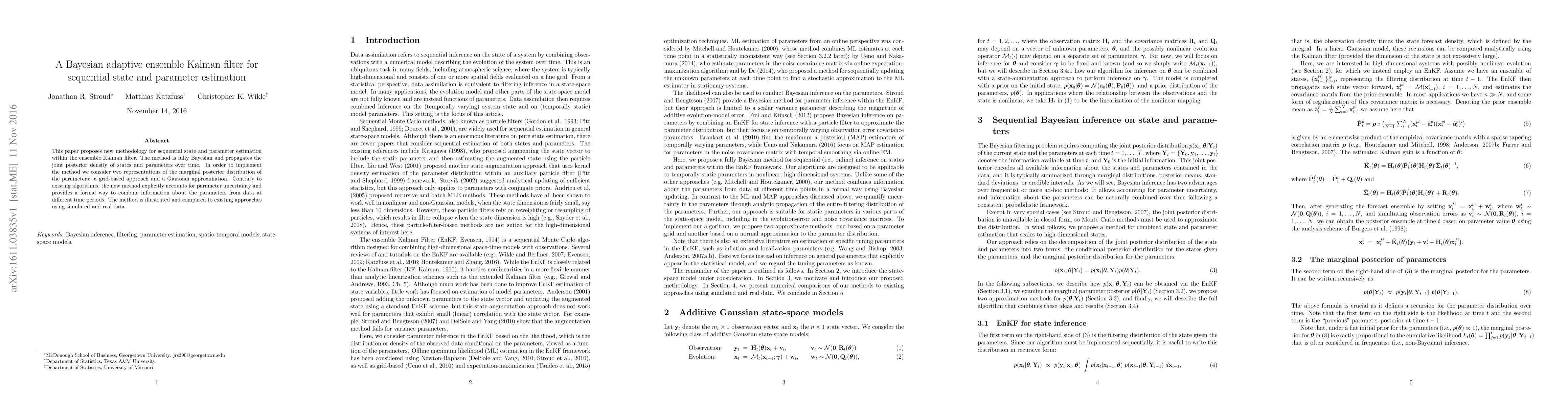 This paper introduces a Bayesian adaptive ensemble Kalman filter for sequential state and parameter estimation, which propagates the joint posterior density of states and parameters. It contrasts with existing methods by explicitly accounting for parameter uncertainty and combining information over time, demonstrated through simulations and real data.