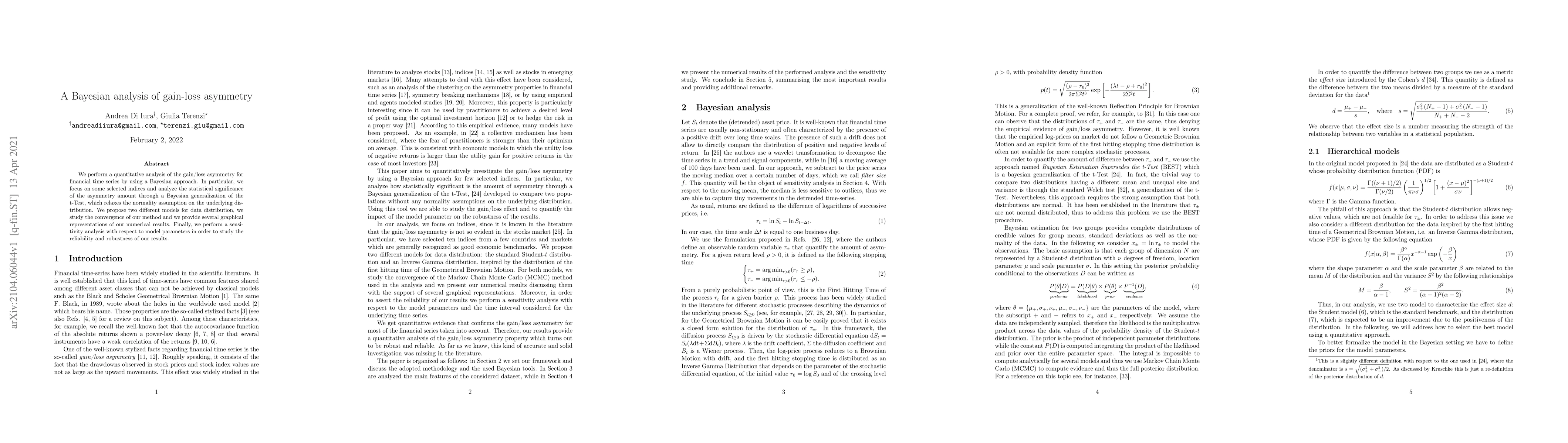 We perform a quantitative analysis of the gain/loss asymmetry for financial time series by using a Bayesian approach. In particular, we focus on some selected indices and analyze the statistical significance of the asymmetry amount through a Bayesian generalization of the t-Test, which relaxes the normality assumption on the underlying distribution. We propose two different models for data distribution, we study the convergence of our method and we provide several graphical representations of our numerical results. Finally, we perform a sensitivity analysis with respect to model parameters in order to study the reliability and robustness of our results.
