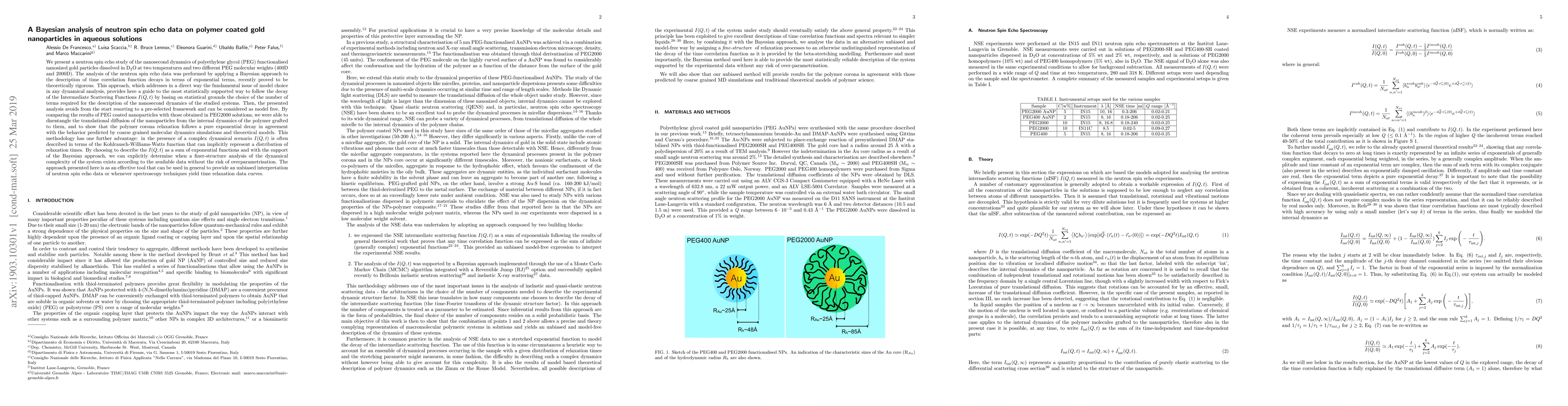 We present a neutron spin echo study (NSE) of the nanosecond dynamics of polyethylene glycol (PEG) functionalised nanosized gold particles dissolved in D$_2$O at two temperatures and two different PEG molecular weights. The analysis of the NSE data was performed by applying a Bayesian approach to the description of time correlation function decays in terms of exponential terms, recently proved to be theoretically rigorous. This approach, which addresses in a direct way the fundamental issue of model choice in any dynamical analysis, provides here a guide to the most statistically supported way to follow the decay of the Intermediate Scattering Functions I(Q, t) by basing on statistical grounds the choice of the number of terms required for the description of the nanosecond dynamics of the studied systems. Then, the presented analysis avoids from the start resorting to a pre-selected framework and can be considered as model free. By comparing the results of PEG coated nanoparticles with those obtained in PEG2000 solutions, we were able to disentangle the translational diffusion of the nanoparticles from the internal dynamics of the polymer grafted to them, and to show that the polymer corona relaxation follows a pure exponential decay in agreement with the behavior predicted by coarse grained molecular dynamics simulations and theoretical models. This methodology has one further advantage: in the presence of a complex dynamical scenario I(Q,t) is often described in terms of the Kohlrausch-Williams-Watts function that can implicitly represent a distribution of relaxation times. By choosing to describe the I(Q,t) as a sum of exponential functions and with the support of the Bayesian approach, we can explicitly determine when a finer-structure analysis of the dynamical complexity of the system exists according to the available data without the risk of overparametrisation.