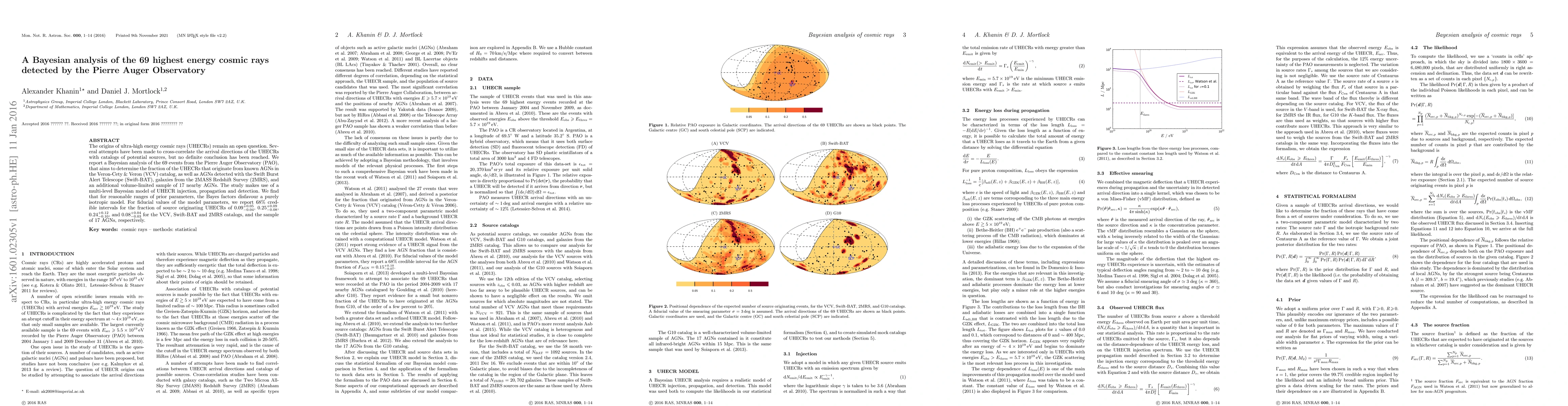 This paper conducts a Bayesian analysis of 69 ultra-high energy cosmic rays detected by the Pierre Auger Observatory to determine the fraction originating from various known sources. The results show that the data disfavor a purely isotropic model and provide credible intervals for the fraction of cosmic rays from different catalogs of potential sources.