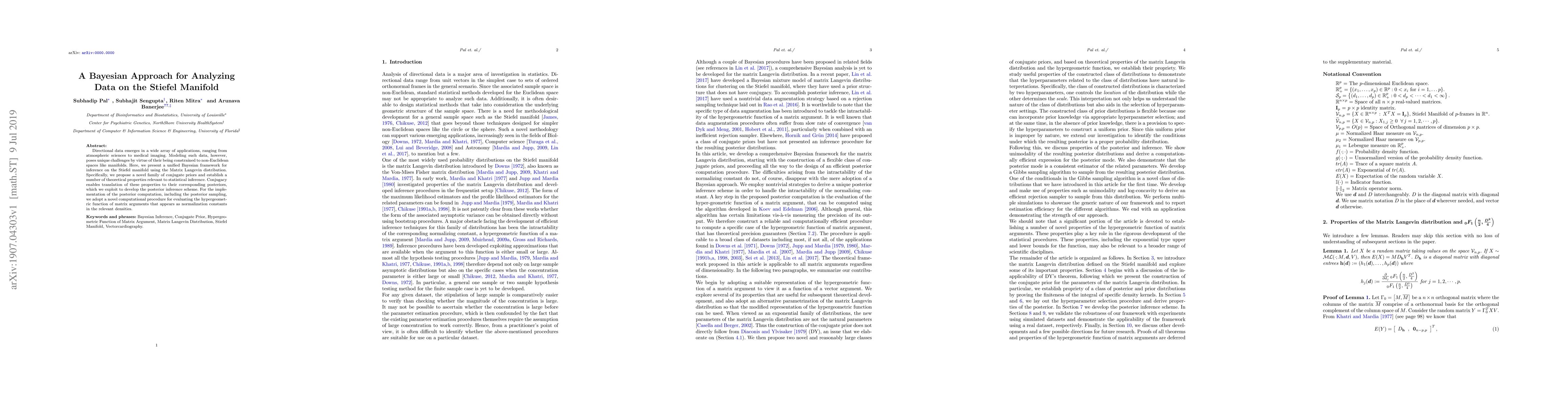 This paper introduces a Bayesian framework for analyzing directional data on the Stiefel manifold using the Matrix Langevin distribution. It proposes a novel family of conjugate priors and develops a computational procedure for posterior sampling, leveraging theoretical properties like propriety and concentration.