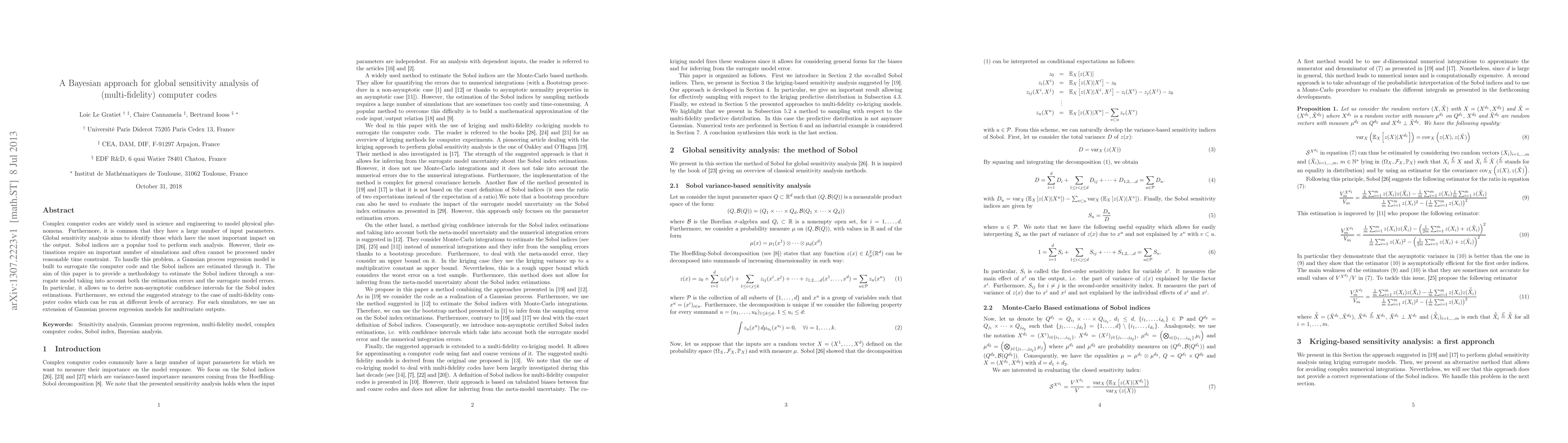 Complex computer codes are widely used in science and engineering to model physical phenomena. Furthermore, it is common that they have a large number of input parameters. Global sensitivity analysis aims to identify those which have the most important impact on the output. Sobol indices are a popular tool to perform such analysis. However, their estimations require an important number of simulations and often cannot be processed under reasonable time constraint. To handle this problem, a Gaussian process regression model is built to surrogate the computer code and the Sobol indices are estimated through it. The aim of this paper is to provide a methodology to estimate the Sobol indices through a surrogate model taking into account both the estimation errors and the surrogate model errors. In particular, it allows us to derive non-asymptotic confidence intervals for the Sobol index estimations. Furthermore, we extend the suggested strategy to the case of multi-fidelity computer codes which can be run at different levels of accuracy. For such simulators, we use an extension of Gaussian process regression models for multivariate outputs.