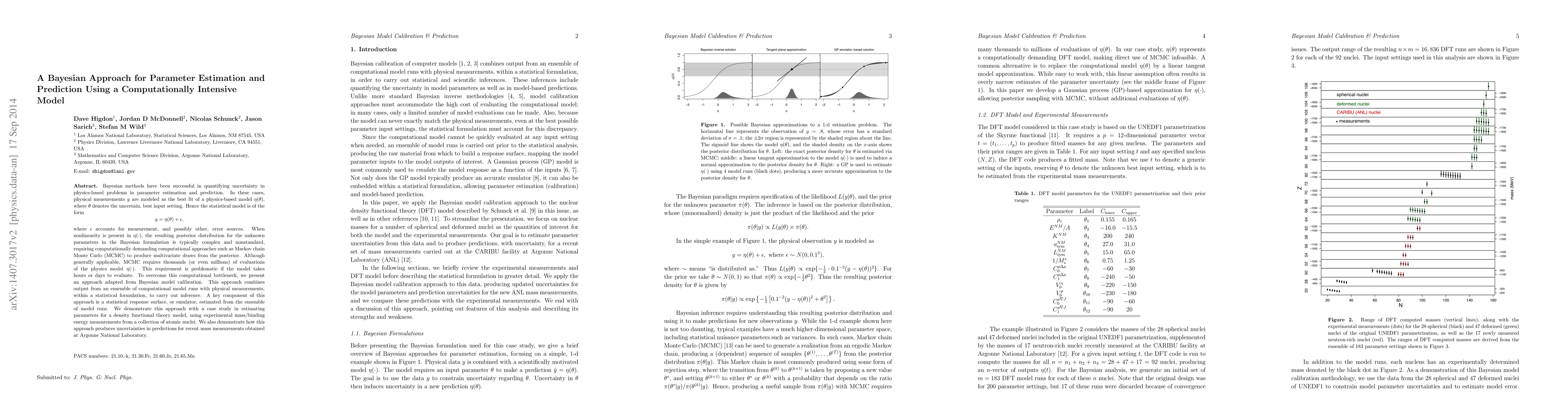 Bayesian methods have been very successful in quantifying uncertainty in physics-based problems in parameter estimation and prediction. In these cases, physical measurements y are modeled as the best fit of a physics-based model $\eta(\theta)$ where $\theta$ denotes the uncertain, best input setting. Hence the statistical model is of the form $y = \eta(\theta) + \epsilon$, where $\epsilon$ accounts for measurement, and possibly other error sources. When non-linearity is present in $\eta(\cdot)$, the resulting posterior distribution for the unknown parameters in the Bayesian formulation is typically complex and non-standard, requiring computationally demanding computational approaches such as Markov chain Monte Carlo (MCMC) to produce multivariate draws from the posterior. While quite generally applicable, MCMC requires thousands, or even millions of evaluations of the physics model $\eta(\cdot)$. This is problematic if the model takes hours or days to evaluate. To overcome this computational bottleneck, we present an approach adapted from Bayesian model calibration. This approach combines output from an ensemble of computational model runs with physical measurements, within a statistical formulation, to carry out inference. A key component of this approach is a statistical response surface, or emulator, estimated from the ensemble of model runs. We demonstrate this approach with a case study in estimating parameters for a density functional theory (DFT) model, using experimental mass/binding energy measurements from a collection of atomic nuclei. We also demonstrate how this approach produces uncertainties in predictions for recent mass measurements obtained at Argonne National Laboratory (ANL).