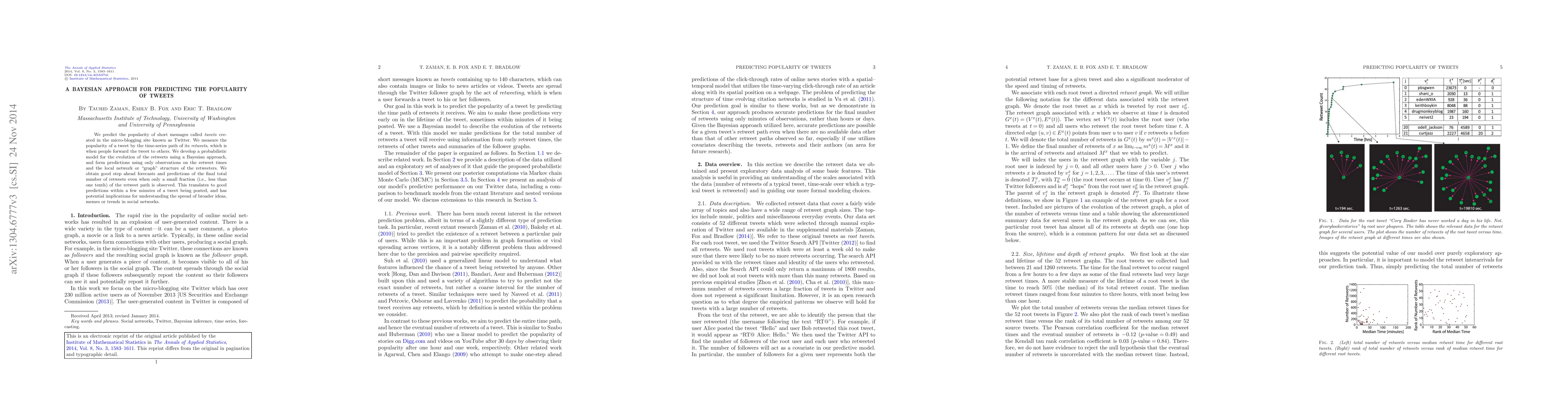 We predict the popularity of short messages called tweets created in the micro-blogging site known as Twitter. We measure the popularity of a tweet by the time-series path of its retweets, which is when people forward the tweet to others. We develop a probabilistic model for the evolution of the retweets using a Bayesian approach, and form predictions using only observations on the retweet times and the local network or "graph" structure of the retweeters. We obtain good step ahead forecasts and predictions of the final total number of retweets even when only a small fraction (i.e., less than one tenth) of the retweet path is observed. This translates to good predictions within a few minutes of a tweet being posted, and has potential implications for understanding the spread of broader ideas, memes, or trends in social networks.