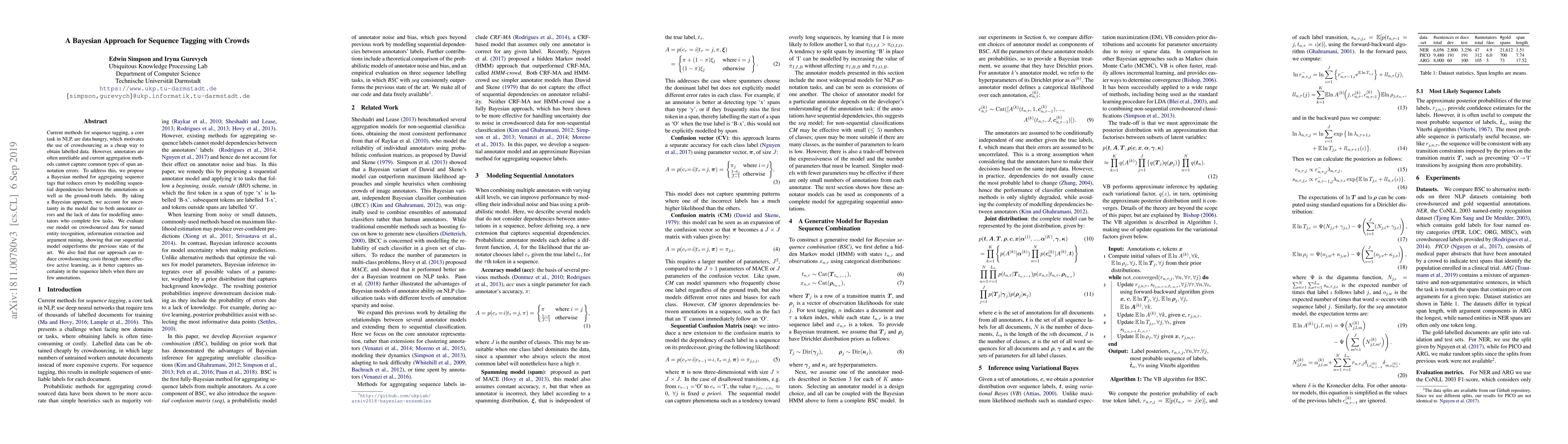 This paper proposes a Bayesian method for sequence tagging using crowdsourced data, addressing unreliable annotators and annotation errors. The model captures sequential dependencies and uncertainty, outperforming previous methods and reducing crowdsourcing costs via effective active learning.