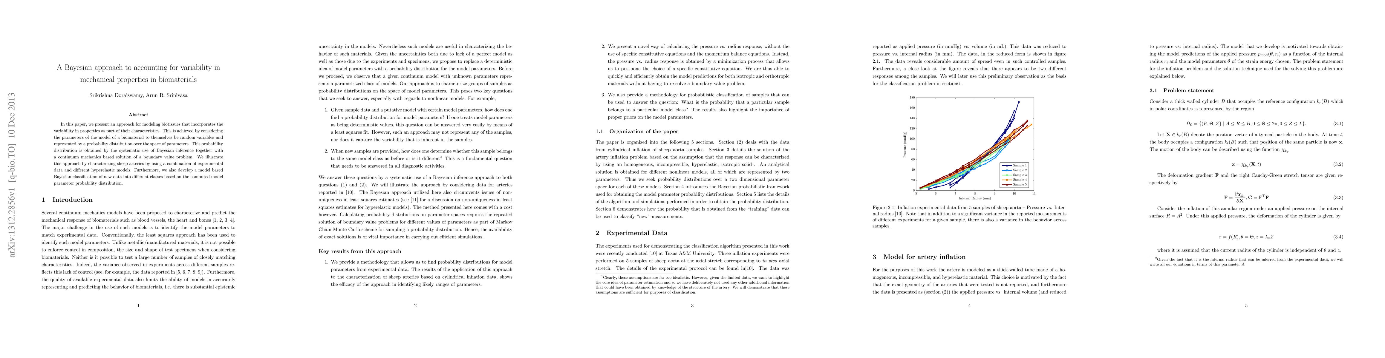 In this paper, we present an approach for modeling bio-tissues that incorporates the variability in properties as part of their characteristics. This is achieved by considering the parameters of the model of a biomaterial to themselves be random variables and represented by a probability distribution over the space of parameters. This probability distribution is obtained by the systematic use of Bayesian inference together with a continuum mechanics based solution of a boundary value problem. We illustrate this approach by characterizing sheep arteries by using a combination of experimental data and different hyperelastic models. Furthermore, we also develop a model based Bayesian classification of new data into different classes based on the computed model parameter probability distribution.