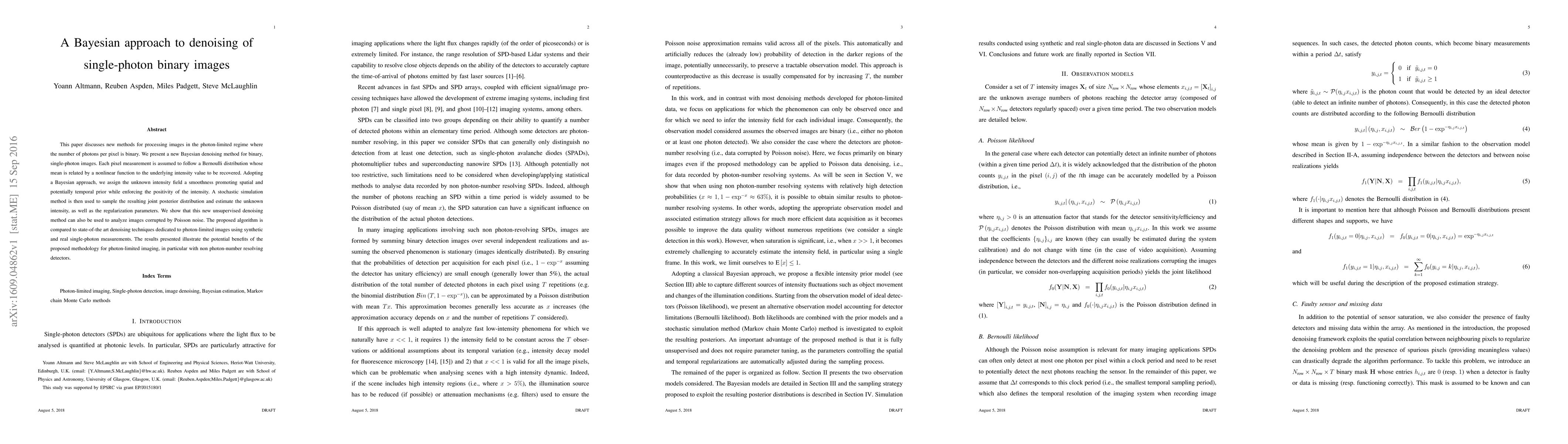 This paper discusses new methods for processing images in the photon-limited regime where the number of photons per pixel is binary. We present a new Bayesian denoising method for binary, single-photon images. Each pixel measurement is assumed to follow a Bernoulli distribution whose mean is related by a nonlinear function to the underlying intensity value to be recovered. Adopting a Bayesian approach, we assign the unknown intensity field a smoothness promoting spatial and potentially temporal prior while enforcing the positivity of the intensity. A stochastic simulation method is then used to sample the resulting joint posterior distribution and estimate the unknown intensity, as well as the regularization parameters. We show that this new unsupervised denoising method can also be used to analyze images corrupted by Poisson noise. The proposed algorithm is compared to state-of-the art denoising techniques dedicated to photon-limited images using synthetic and real single-photon measurements. The results presented illustrate the potential benefits of the proposed methodology for photon-limited imaging, in particular with non photonnumber resolving detectors.