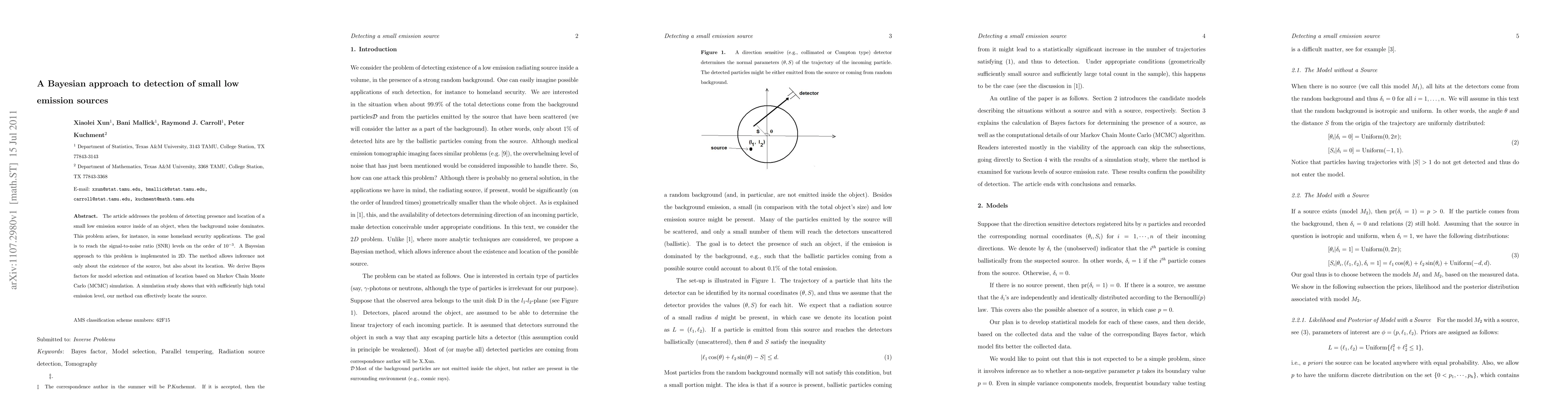 The article addresses the problem of detecting presence and location of a small low emission source inside of an object, when the background noise dominates. This problem arises, for instance, in some homeland security applications. The goal is to reach the signal-to-noise ratio (SNR) levels on the order of $10^{-3}$. A Bayesian approach to this problem is implemented in 2D. The method allows inference not only about the existence of the source, but also about its location. We derive Bayes factors for model selection and estimation of location based on Markov Chain Monte Carlo (MCMC) simulation. A simulation study shows that with sufficiently high total emission level, our method can effectively locate the source.