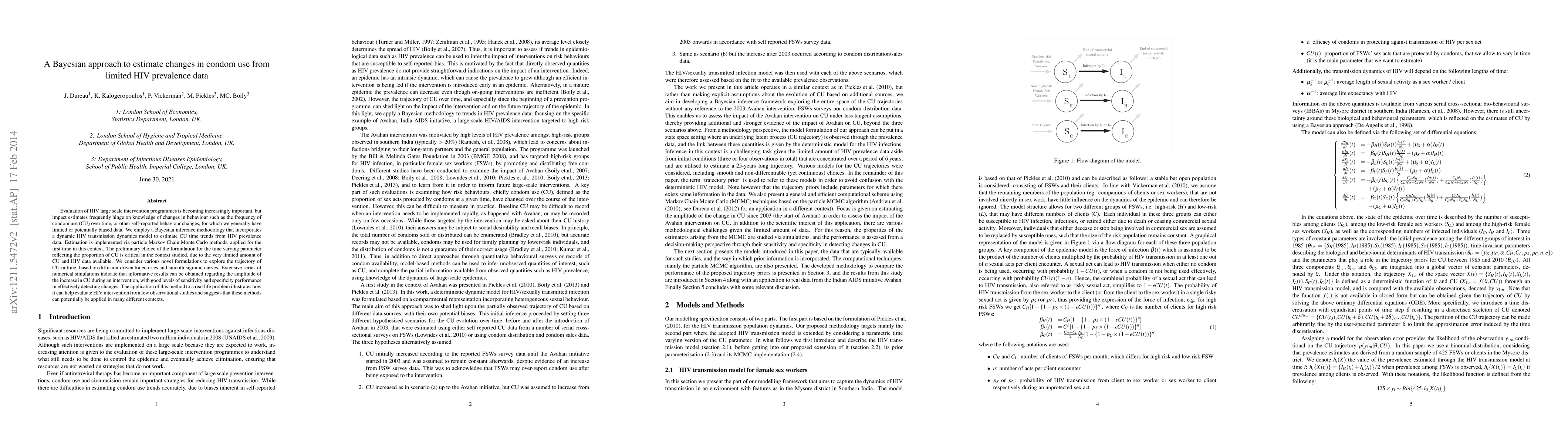 This paper proposes a Bayesian method using particle Markov Chain Monte Carlo to estimate trends in condom use from limited HIV prevalence data, incorporating dynamic HIV transmission models. The approach shows promising results in detecting changes in condom use during interventions, demonstrating potential for evaluating HIV interventions with sparse observational data.