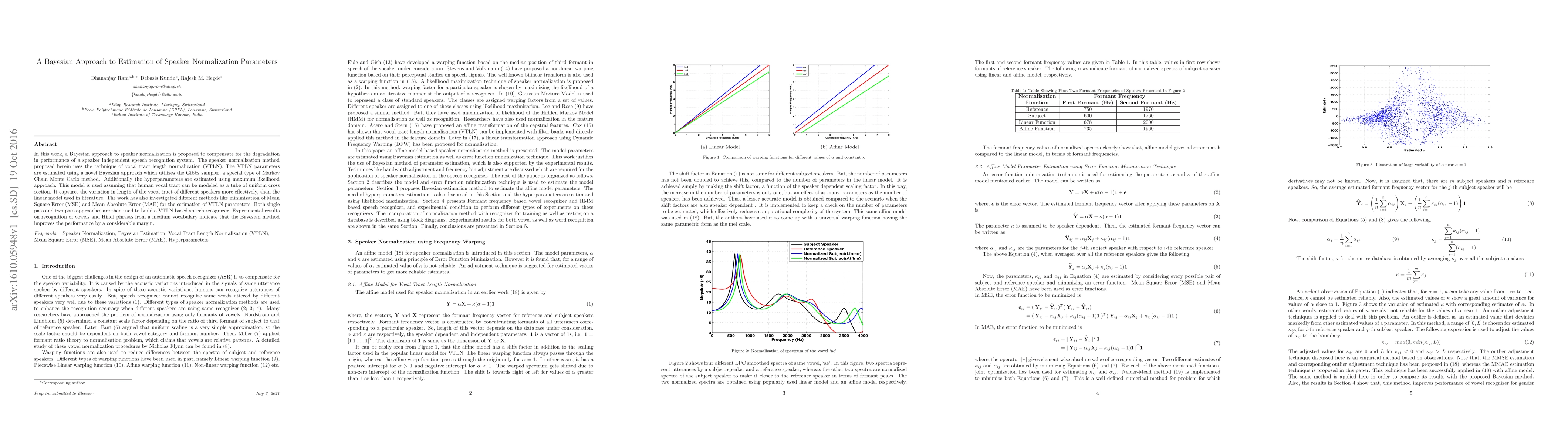 In this work, a Bayesian approach to speaker normalization is proposed to compensate for the degradation in performance of a speaker independent speech recognition system. The speaker normalization method proposed herein uses the technique of vocal tract length normalization (VTLN). The VTLN parameters are estimated using a novel Bayesian approach which utilizes the Gibbs sampler, a special type of Markov Chain Monte Carlo method. Additionally the hyperparameters are estimated using maximum likelihood approach. This model is used assuming that human vocal tract can be modeled as a tube of uniform cross section. It captures the variation in length of the vocal tract of different speakers more effectively, than the linear model used in literature. The work has also investigated different methods like minimization of Mean Square Error (MSE) and Mean Absolute Error (MAE) for the estimation of VTLN parameters. Both single pass and two pass approaches are then used to build a VTLN based speech recognizer. Experimental results on recognition of vowels and Hindi phrases from a medium vocabulary indicate that the Bayesian method improves the performance by a considerable margin.