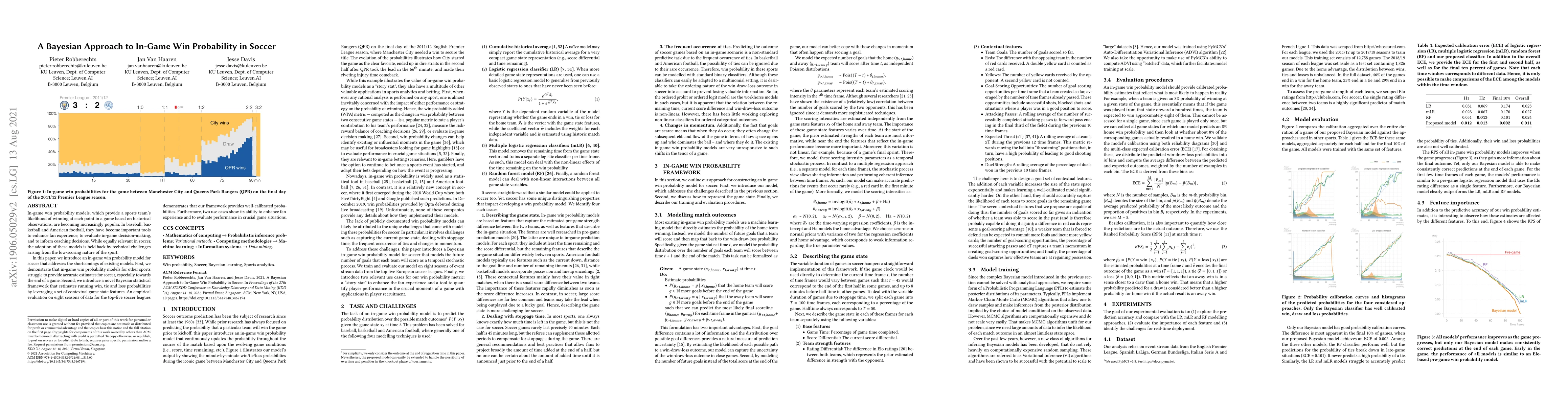 In-game win probability models, which provide a sports team's likelihood of winning at each point in a game based on historical observations, are becoming increasingly popular. In baseball, basketball and American football, they have become important tools to enhance fan experience, to evaluate in-game decision-making, and to inform coaching decisions. While equally relevant in soccer, the adoption of these models is held back by technical challenges arising from the low-scoring nature of the sport. In this paper, we introduce an in-game win probability model for soccer that addresses the shortcomings of existing models. First, we demonstrate that in-game win probability models for other sports struggle to provide accurate estimates for soccer, especially towards the end of a game. Second, we introduce a novel Bayesian statistical framework that estimates running win, tie and loss probabilities by leveraging a set of contextual game state features. An empirical evaluation on eight seasons of data for the top-five soccer leagues demonstrates that our framework provides well-calibrated probabilities. Furthermore, two use cases show its ability to enhance fan experience and to evaluate performance in crucial game situations.