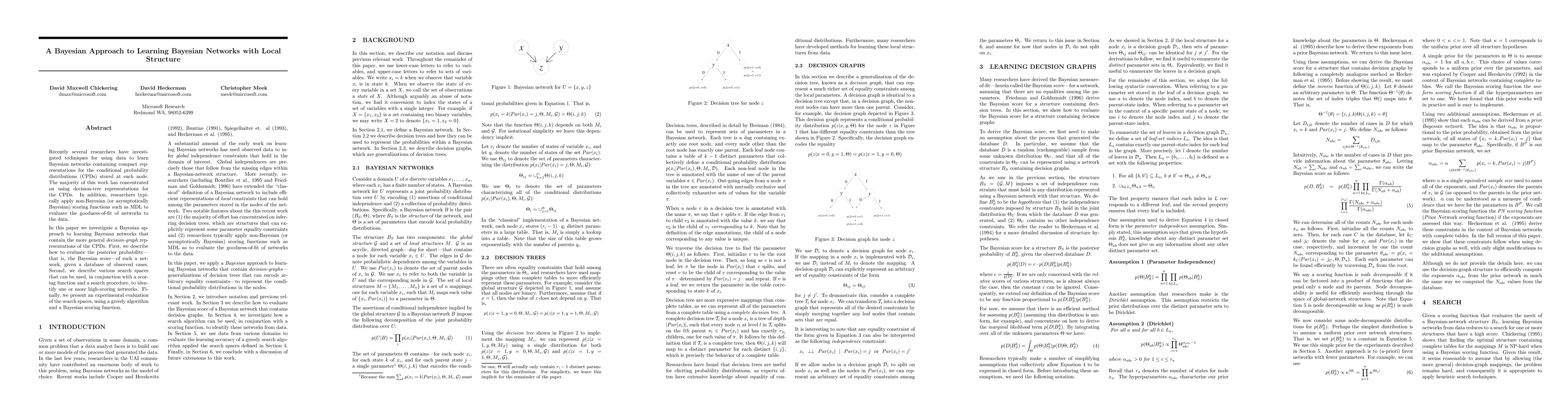 This paper proposes a Bayesian method for learning Bayesian networks with decision-graph representations for conditional probability distributions. It evaluates the posterior probability of networks and explores various search spaces to identify high-scoring networks, concluding with an experimental evaluation using a greedy algorithm and Bayesian scoring function.