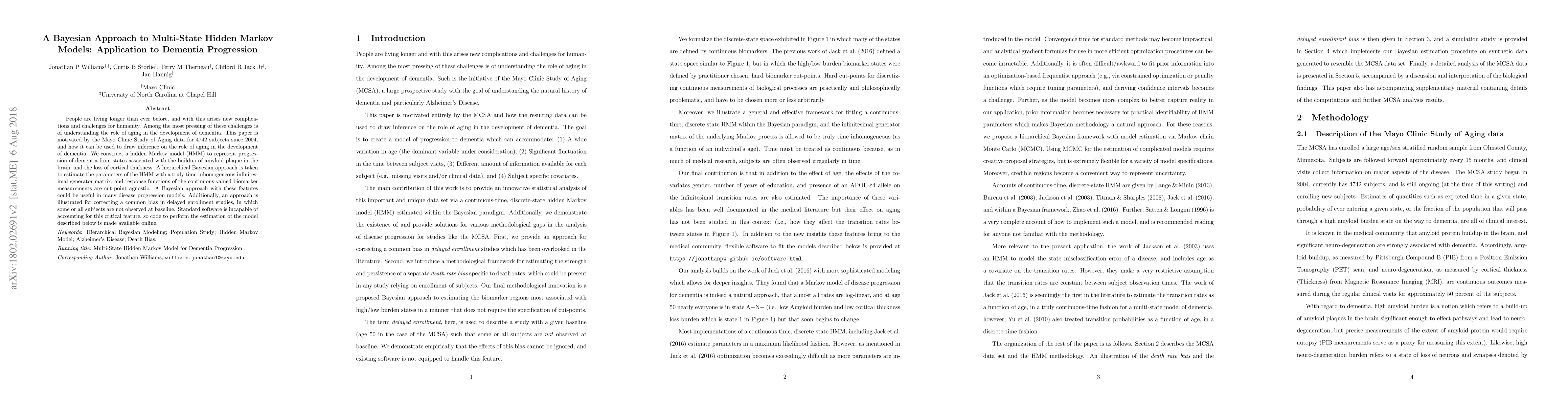 People are living longer than ever before, and with this arises new complications and challenges for humanity. Among the most pressing of these challenges is of understanding the role of aging in the development of dementia. This paper is motivated by the Mayo Clinic Study of Aging data for 4742 subjects since 2004, and how it can be used to draw inference on the role of aging in the development of dementia. We construct a hidden Markov model (HMM) to represent progression of dementia from states associated with the buildup of amyloid plaque in the brain, and the loss of cortical thickness. A hierarchical Bayesian approach is taken to estimate the parameters of the HMM with a truly time-inhomogeneous infinitesimal generator matrix, and response functions of the continuous-valued biomarker measurements are cut-point agnostic. A Bayesian approach with these features could be useful in many disease progression models. Additionally, an approach is illustrated for correcting a common bias in delayed enrollment studies, in which some or all subjects are not observed at baseline. Standard software is incapable of accounting for this critical feature, so code to perform the estimation of the model described below is made available online.