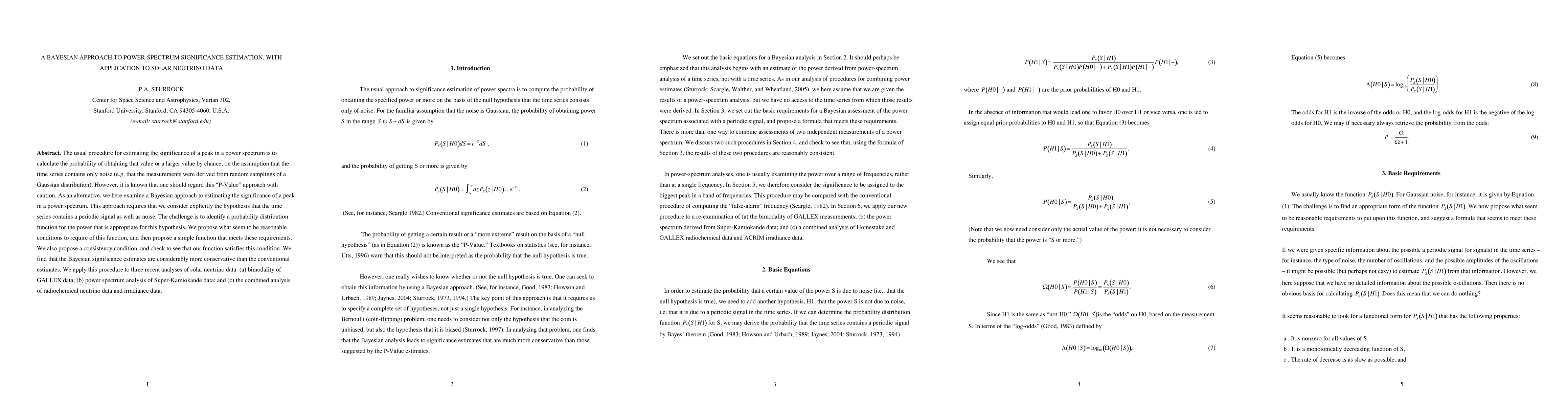 This paper proposes a Bayesian method for estimating the significance of peaks in power spectra, contrasting it with conventional P-value approaches. The Bayesian method considers both noise and periodic signals, leading to more conservative estimates, which are applied to solar neutrino data analyses.