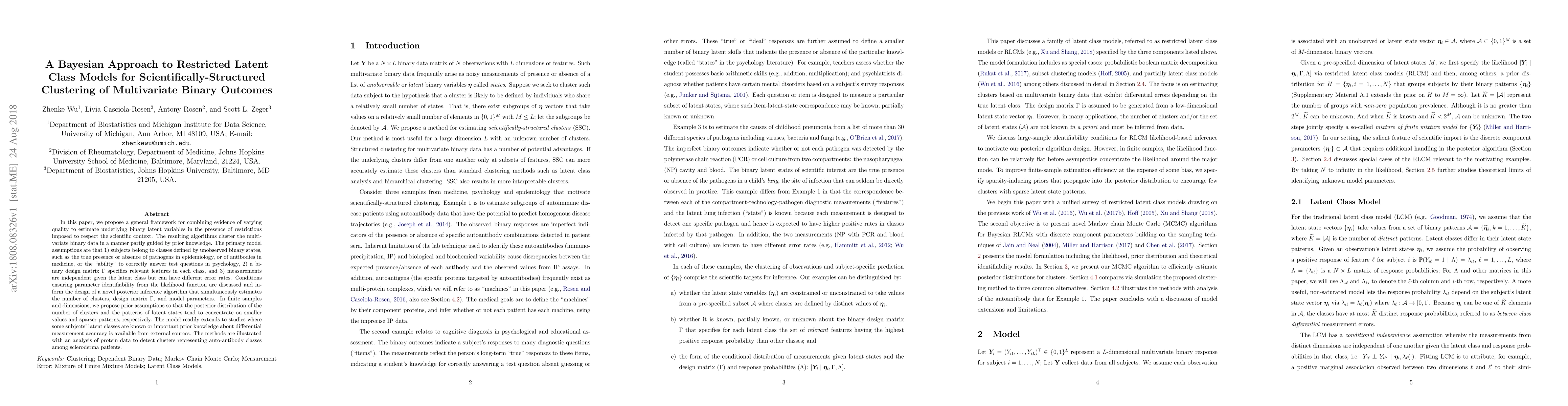 In this paper, we propose a general framework for combining evidence of varying quality to estimate underlying binary latent variables in the presence of restrictions imposed to respect the scientific context. The resulting algorithms cluster the multivariate binary data in a manner partly guided by prior knowledge. The primary model assumptions are that 1) subjects belong to classes defined by unobserved binary states, such as the true presence or absence of pathogens in epidemiology, or of antibodies in medicine, or the "ability" to correctly answer test questions in psychology, 2) a binary design matrix $\Gamma$ specifies relevant features in each class, and 3) measurements are independent given the latent class but can have different error rates. Conditions ensuring parameter identifiability from the likelihood function are discussed and inform the design of a novel posterior inference algorithm that simultaneously estimates the number of clusters, design matrix $\Gamma$, and model parameters. In finite samples and dimensions, we propose prior assumptions so that the posterior distribution of the number of clusters and the patterns of latent states tend to concentrate on smaller values and sparser patterns, respectively. The model readily extends to studies where some subjects' latent classes are known or important prior knowledge about differential measurement accuracy is available from external sources. The methods are illustrated with an analysis of protein data to detect clusters representing auto-antibody classes among scleroderma patients.