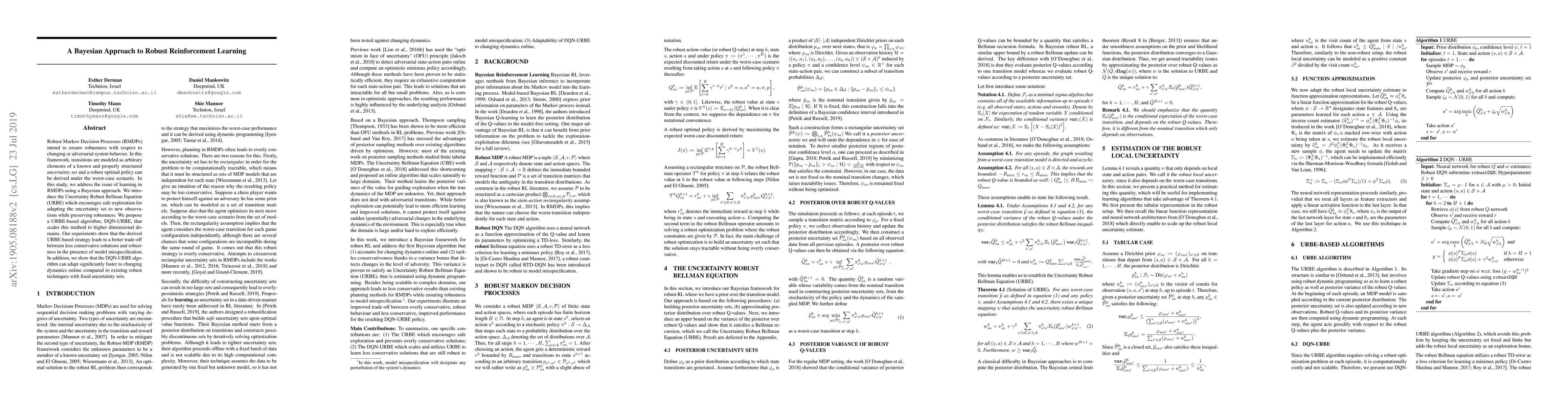Robust Markov Decision Processes (RMDPs) intend to ensure robustness with respect to changing or adversarial system behavior. In this framework, transitions are modeled as arbitrary elements of a known and properly structured uncertainty set and a robust optimal policy can be derived under the worst-case scenario. In this study, we address the issue of learning in RMDPs using a Bayesian approach. We introduce the Uncertainty Robust Bellman Equation (URBE) which encourages safe exploration for adapting the uncertainty set to new observations while preserving robustness. We propose a URBE-based algorithm, DQN-URBE, that scales this method to higher dimensional domains. Our experiments show that the derived URBE-based strategy leads to a better trade-off between less conservative solutions and robustness in the presence of model misspecification. In addition, we show that the DQN-URBE algorithm can adapt significantly faster to changing dynamics online compared to existing robust techniques with fixed uncertainty sets.