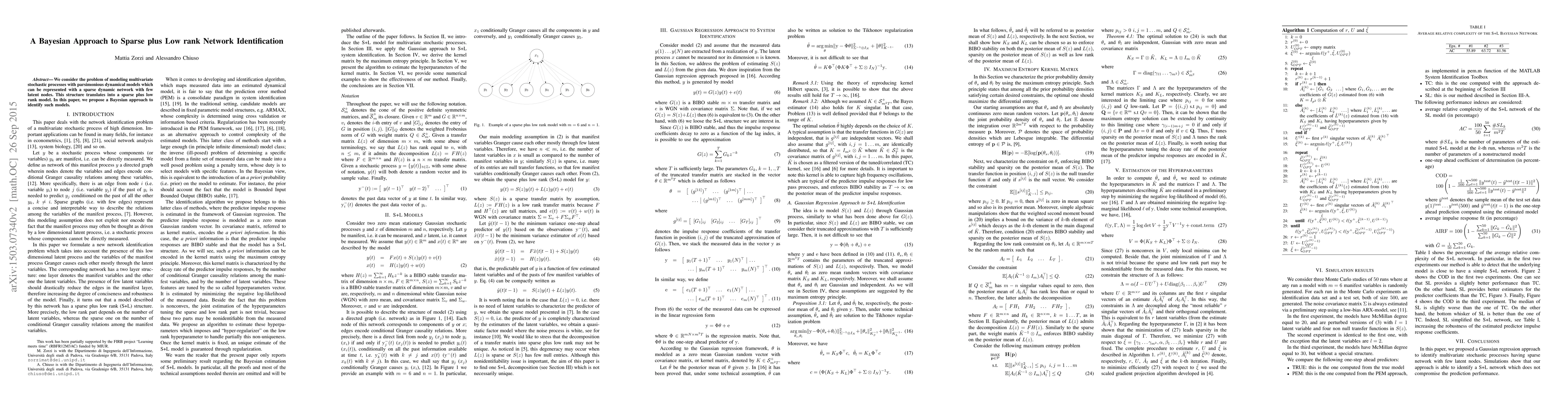 This paper proposes a Bayesian Gaussian regression method for identifying sparse plus low rank dynamic Bayesian networks to model multivariate time series efficiently. The approach aims to uncover parsimonious dynamical models with minimal latent nodes.