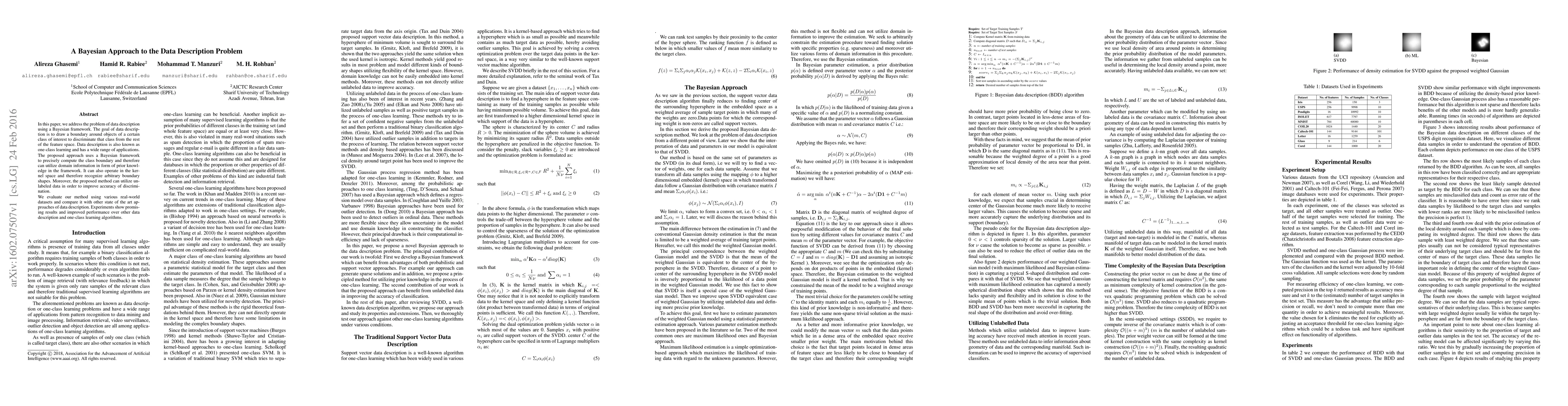 In this paper, we address the problem of data description using a Bayesian framework. The goal of data description is to draw a boundary around objects of a certain class of interest to discriminate that class from the rest of the feature space. Data description is also known as one-class learning and has a wide range of applications. The proposed approach uses a Bayesian framework to precisely compute the class boundary and therefore can utilize domain information in form of prior knowledge in the framework. It can also operate in the kernel space and therefore recognize arbitrary boundary shapes. Moreover, the proposed method can utilize unlabeled data in order to improve accuracy of discrimination. We evaluate our method using various real-world datasets and compare it with other state of the art approaches of data description. Experiments show promising results and improved performance over other data description and one-class learning algorithms.