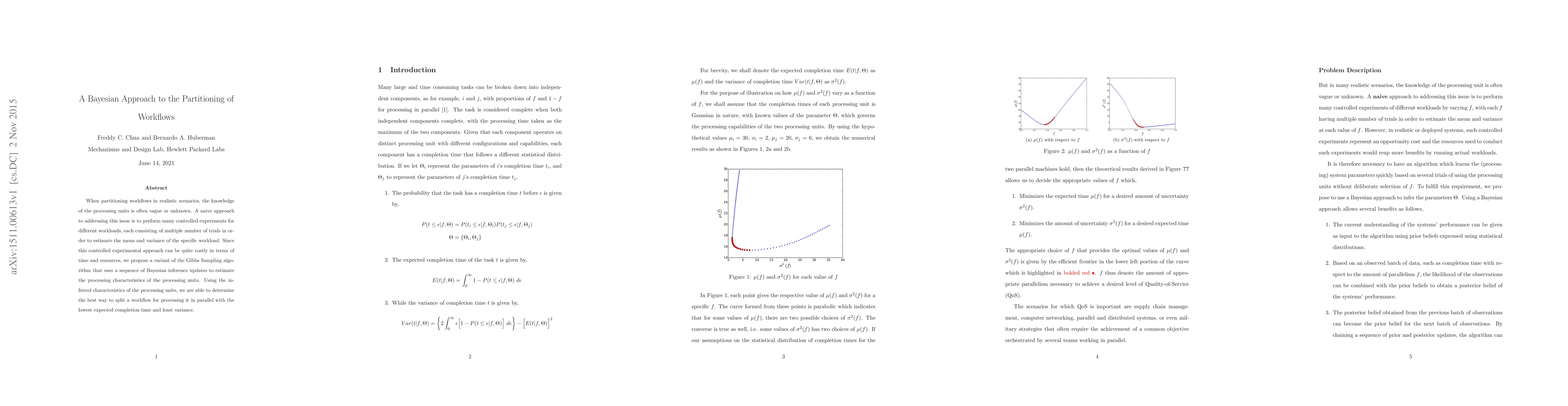 This paper proposes a Bayesian approach to partitioning workflows, allowing for more efficient and accurate parallel processing without requiring extensive controlled experiments. It uses Gibbs Sampling algorithm to estimate processing unit characteristics and determine the optimal workflow split for minimal completion time and variance.