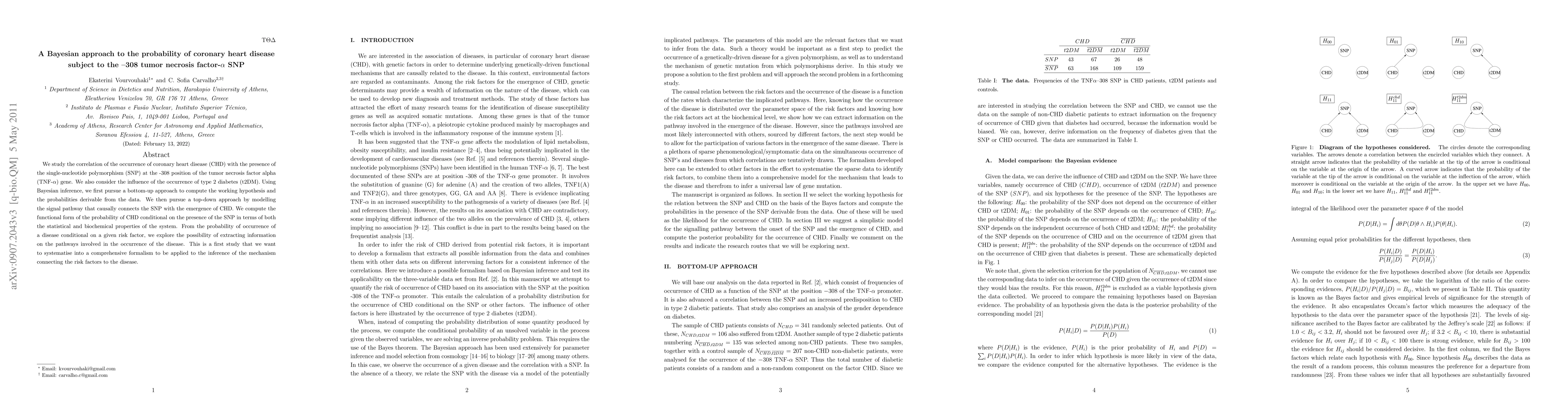 We study the correlation of the occurrence of coronary heart disease (CHD) with the presence of the single-nucleotide polymorphism (SNP) at the -308 position of the tumor necrosis factor alpha (TNF-$\alpha$) gene. We also consider the influence of the occurrence of type 2 diabetes (t2DM). Using Bayesian inference, we first pursue a bottom-up approach to compute the working hypothesis and the probabilities derivable from the data. We then pursue a top-down approach by modelling the signal pathway that causally connects the SNP with the emergence of CHD. We compute the functional form of the probability of CHD conditional on the presence of the SNP in terms of both the statistical and biochemical properties of the system. From the probability of occurrence of a disease conditional on a given risk factor, we explore the possibility of extracting information on the pathways involved in the occurrence of the disease. This is a first study that we want to systematise into a comprehensive formalism to be applied to the inference of the mechanism connecting the risk factors to the disease.