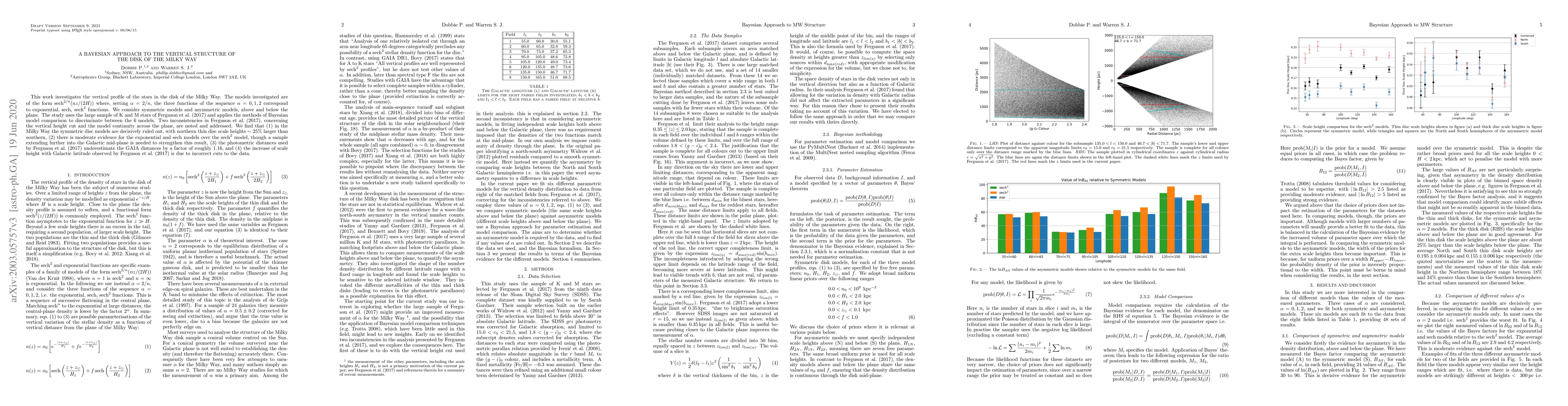 This paper uses Bayesian methods to analyze the vertical structure of the Milky Way's disk, comparing symmetric and asymmetric models based on star data. It finds that symmetric models are unlikely, with northern scale heights being larger, and suggests that the exponential and $sech$ models are more plausible, though more data is needed.