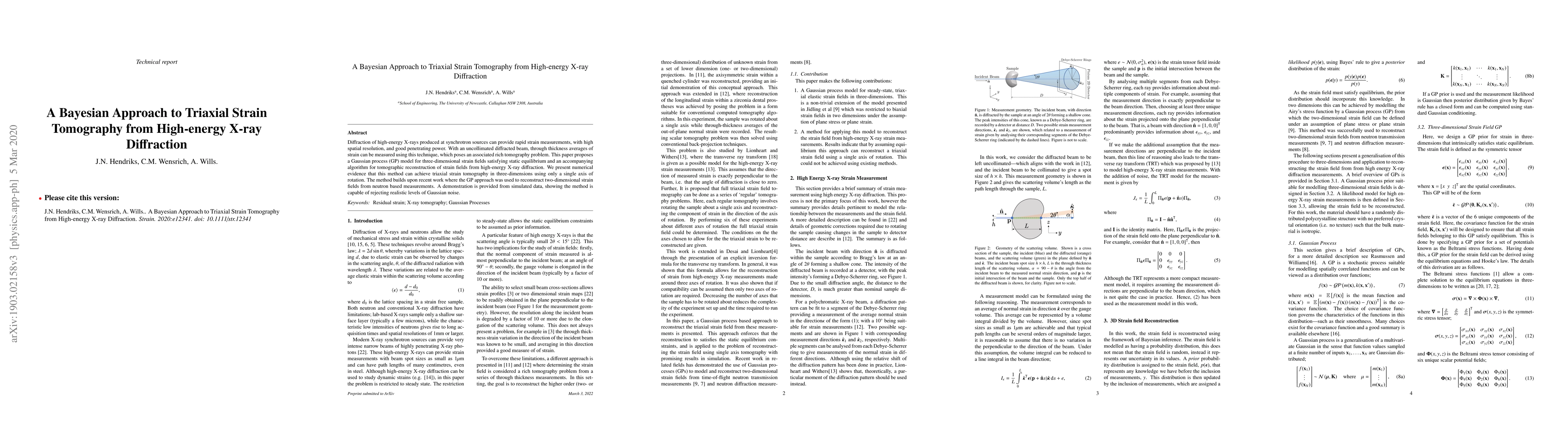 This paper proposes a Bayesian Gaussian process model for reconstructing three-dimensional triaxial strain fields from high-energy X-ray diffraction data, achieving tomography with a single axis of rotation. The method demonstrates robustness against Gaussian noise through simulated data.