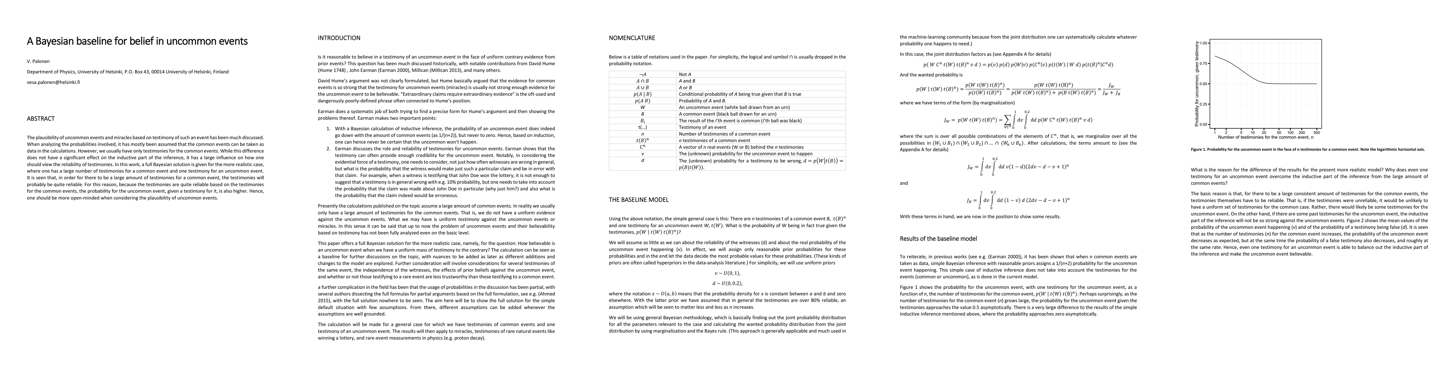 The plausibility of uncommon events and miracles based on testimony of such an event has been much discussed. When analyzing the probabilities involved, it has mostly been assumed that the common events can be taken as data in the calculations. However, we usually have only testimonies for the common events. While this difference does not have a significant effect on the inductive part of the inference, it has a large influence on how one should view the reliability of testimonies. In this work, a full Bayesian solution is given for the more realistic case, where one has a large number of testimonies for a common event and one testimony for an uncommon event. It is seen that, in order for there to be a large amount of testimonies for a common event, the testimonies will probably be quite reliable. For this reason, because the testimonies are quite reliable based on the testimonies for the common events, the probability for the uncommon event, given a testimony for it, is also higher. Hence, one should be more open-minded when considering the plausibility of uncommon events.