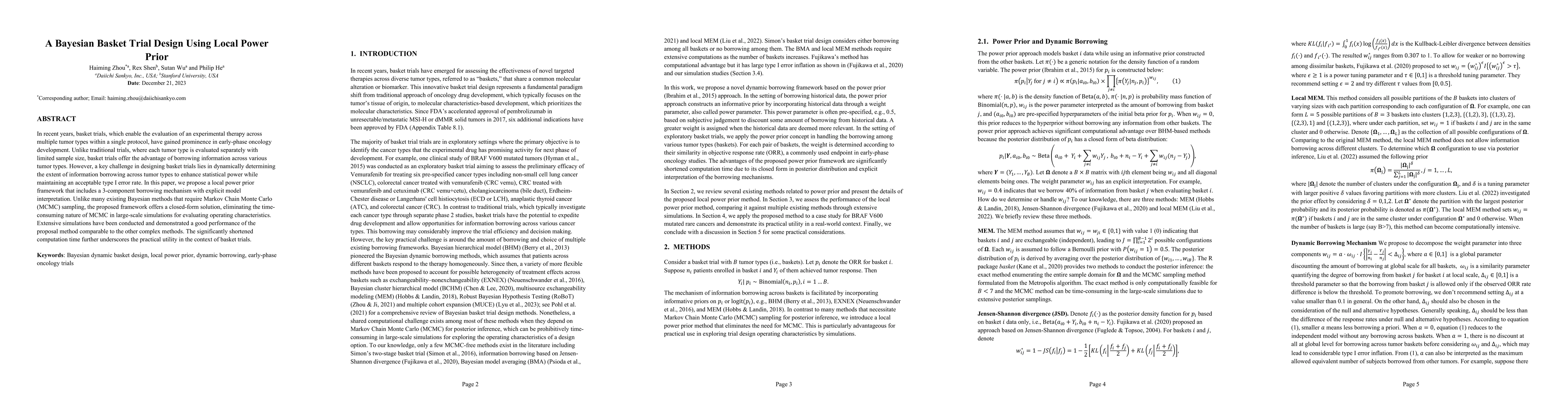 This paper proposes a Bayesian basket trial design using a local power prior framework that borrows information across multiple tumor types to enhance statistical power without increasing type I error rates. The method offers a closed-form solution, providing a significant reduction in computation time compared to MCMC-based methods, making it practical for large-scale simulations.