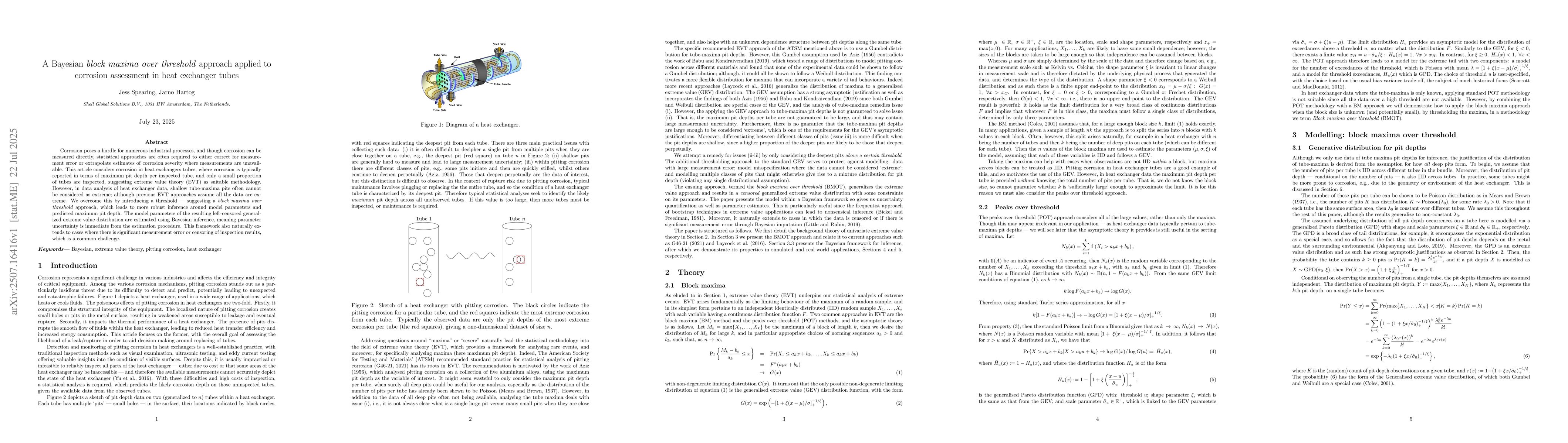 Corrosion poses a hurdle for numerous industrial processes, and though corrosion can be measured directly, statistical approaches are often required to either correct for measurement error or extrapolate estimates of corrosion severity where measurements are unavailable. This article considers corrosion in heat exchangers tubes, where corrosion is typically reported in terms of maximum pit depth per inspected tube, and only a small proportion of tubes are inspected, suggesting extreme value theory (EVT) as suitable methodology. However, in data analysis of heat exchanger data, shallow tube-maxima pits often cannot be considered as extreme; although previous EVT approaches assume all the data are extreme. We overcome this by introducing a threshold - suggesting a block maxima over threshold approach, which leads to more robust inference around model parameters and predicted maximum pit depth.