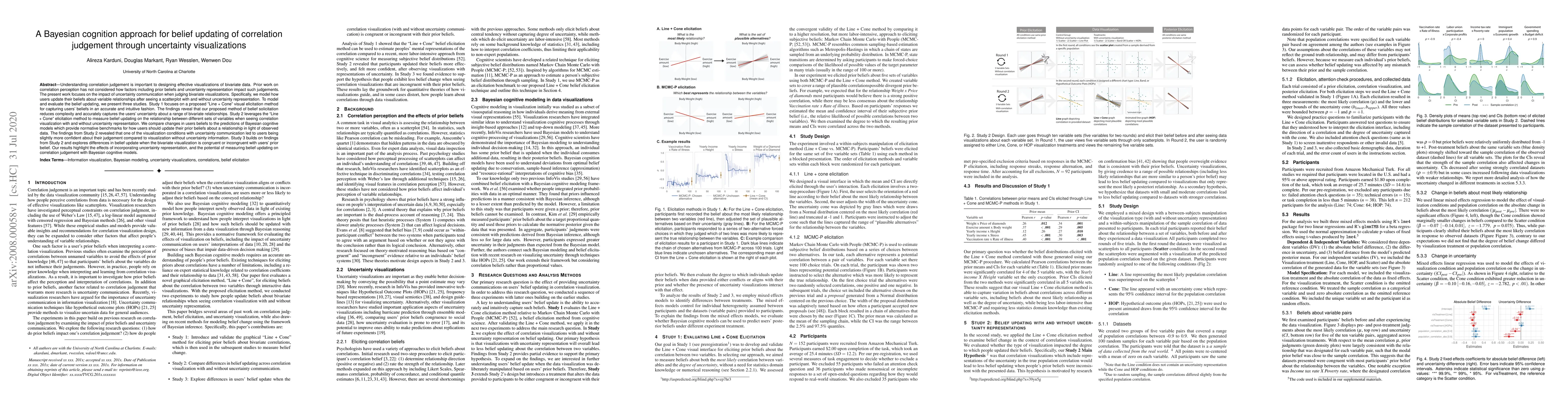This paper explores how uncertainty visualizations affect users' belief updating in correlation judgements using Bayesian cognitive models. The studies introduce a 'Line + Cone' method for belief elicitation, find that uncertainty representation slightly increases confidence in judgements, and show that belief updates depend on visualization congruence with prior beliefs.
