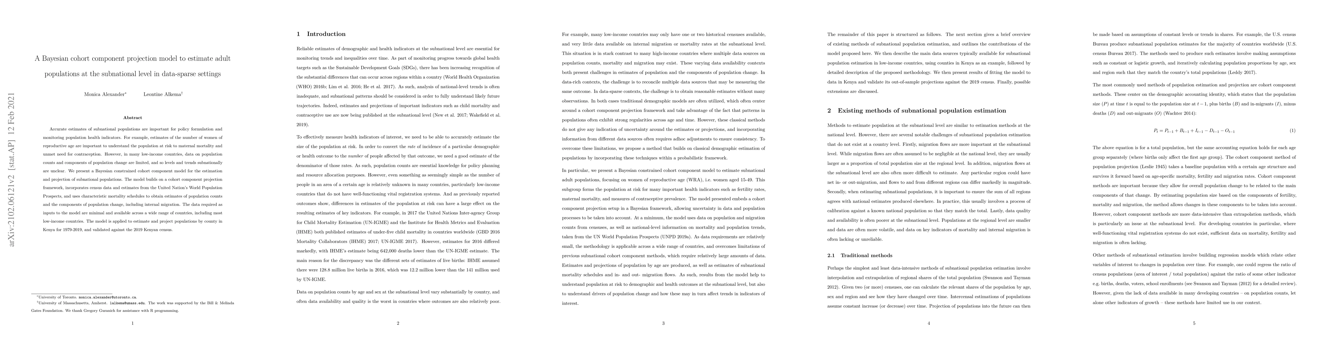 This paper introduces a Bayesian cohort component model to estimate subnational adult populations in data-sparse settings, using minimal inputs like census data and UN estimates. The model is applied to Kenya, projecting county populations from 1979 to 2019 and validated against the 2019 census.