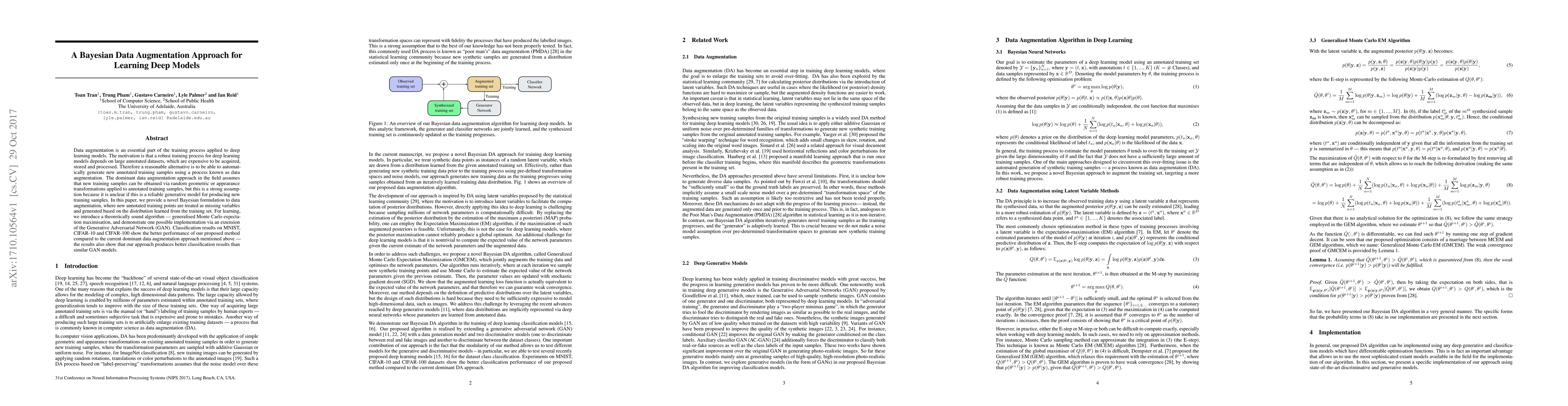 This paper introduces a Bayesian data augmentation approach to learn deep models using a novel formulation that generates new annotated training samples based on the distribution learned from the existing dataset. The proposed method outperforms current dominant approaches in classification results for MNIST, CIFAR-10, and CIFAR-100 datasets.