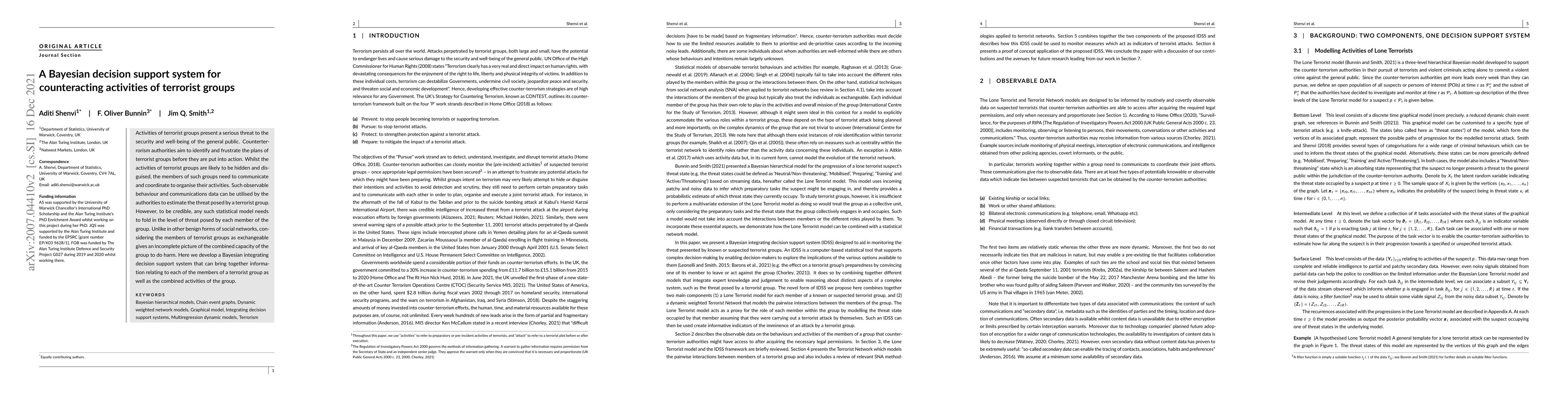 Activities of terrorist groups present a serious threat to the security and well-being of the general public. Counterterrorism authorities aim to identify and frustrate the plans of terrorist groups before they are put into action. Whilst the activities of terrorist groups are likely to be hidden and disguised, the members of such groups need to communicate and coordinate to organise their activities. Such observable behaviour and communications data can be utilised by the authorities to estimate the threat posed by a terrorist group. However, to be credible, any such statistical model needs to fold in the level of threat posed by each member of the group. Unlike in other benign forms of social networks, considering the members of terrorist groups as exchangeable gives an incomplete picture of the combined capacity of the group to do harm. Here we develop a Bayesian integrating decision support system that can bring together information relating to each of the members of a terrorist group as well as the combined activities of the group.