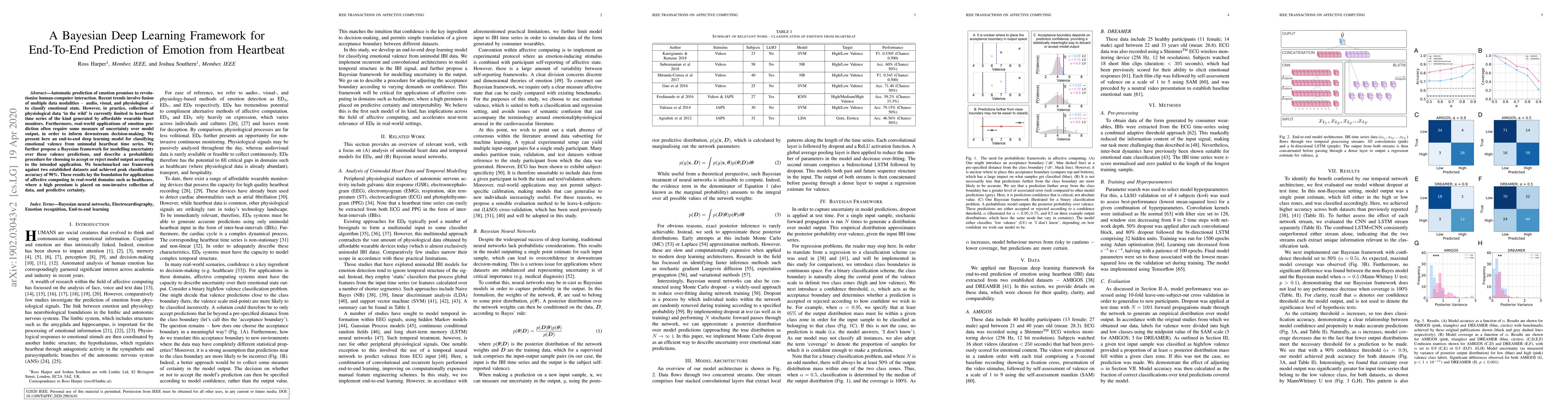 Automatic prediction of emotion promises to revolutionise human-computer interaction. Recent trends involve fusion of multiple data modalities - audio, visual, and physiological - to classify emotional state. However, in practice, collection of physiological data `in the wild' is currently limited to heartbeat time series of the kind generated by affordable wearable heart monitors. Furthermore, real-world applications of emotion prediction often require some measure of uncertainty over model output, in order to inform downstream decision-making. We present here an end-to-end deep learning model for classifying emotional valence from unimodal heartbeat time series. We further propose a Bayesian framework for modelling uncertainty over these valence predictions, and describe a probabilistic procedure for choosing to accept or reject model output according to the intended application. We benchmarked our framework against two established datasets and achieved peak classification accuracy of 90%. These results lay the foundation for applications of affective computing in real-world domains such as healthcare, where a high premium is placed on non-invasive collection of data, and predictive certainty.