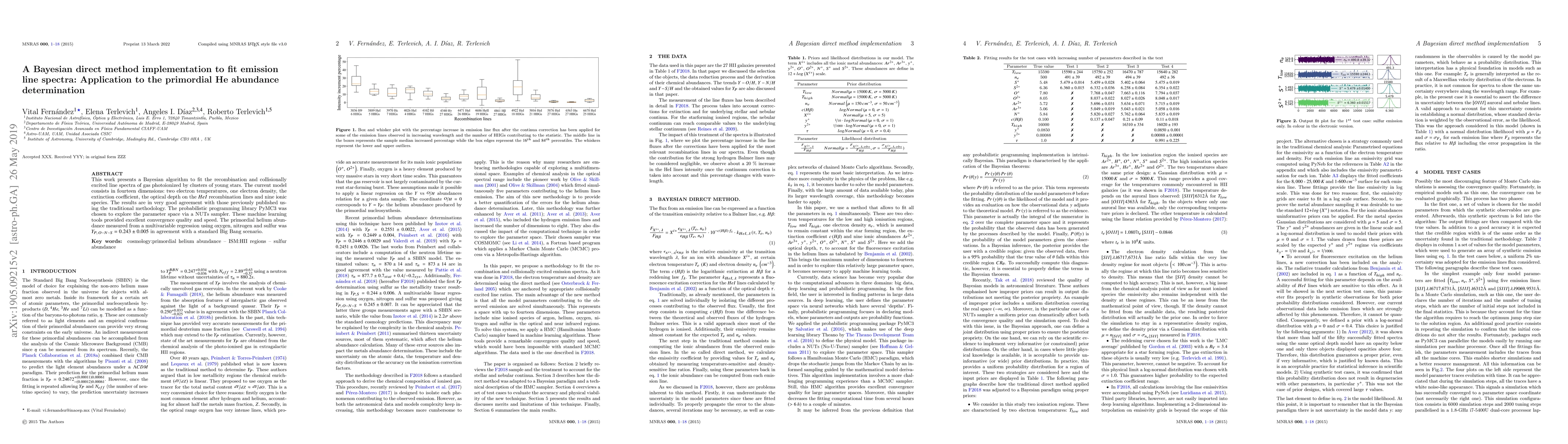 This work presents a Bayesian algorithm to fit the recombination and collisionally excited line spectra of gas photoionized by clusters of young stars. The current model consists in fourteen dimensions: two electron temperatures, one electron density, the extinction coefficient, the optical depth on the $HeI$ recombination lines and nine ionic species. The results are in very good agreement with those previously published using the traditional methodology. The probabilistic programming library PyMC3 was chosen to explore the parameter space via a NUTs sampler. These machine learning tools provided excellent convergence quality and speed. The primordial helium abundance measured from a multivariable regression using oxygen, nitrogen and sulfur was $Y_{P,\,O-N-S}=0.243\pm0.005$ in agreement with a standard Big Bang scenario.