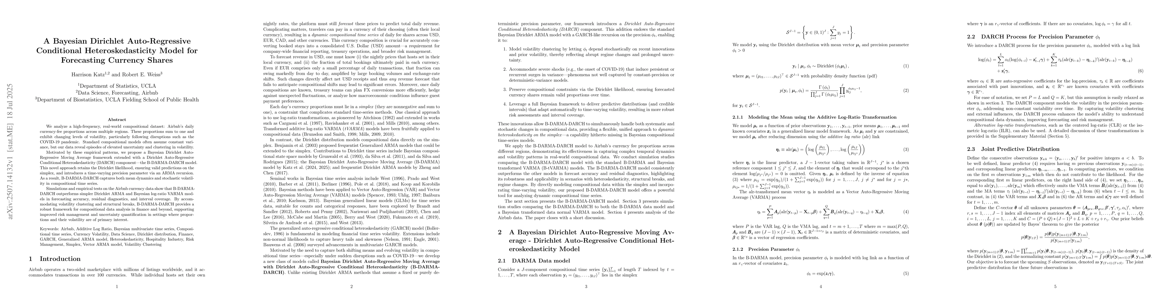 We analyze daily Airbnb service-fee shares across eleven settlement currencies, a compositional series that shows bursts of volatility after shocks such as the COVID-19 pandemic. Standard Dirichlet time series models assume constant precision and therefore miss these episodes. We introduce B-DARMA-DARCH, a Bayesian Dirichlet autoregressive moving average model with a Dirichlet ARCH component, which lets the precision parameter follow an ARMA recursion. The specification preserves the Dirichlet likelihood so forecasts remain valid compositions while capturing clustered volatility. Simulations and out-of-sample tests show that B-DARMA-DARCH lowers forecast error and improves interval calibration relative to Dirichlet ARMA and log-ratio VARMA benchmarks, providing a concise framework for settings where both the level and the volatility of proportions matter.