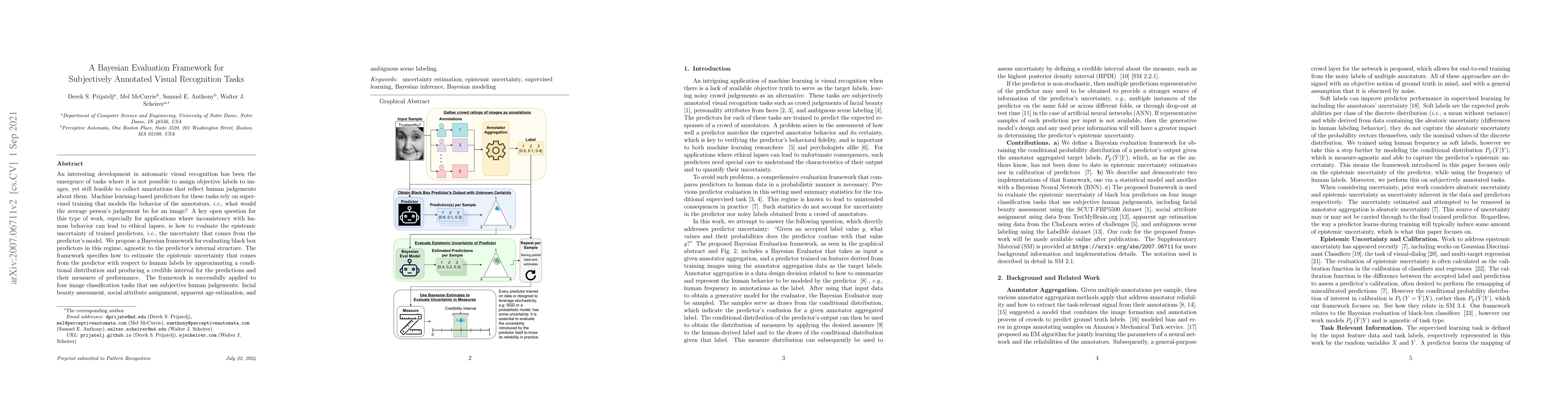 A Bayesian framework evaluates subjective visual recognition tasks by estimating epistemic uncertainty in machine learning predictors, providing a clear measure of confidence in predictions.