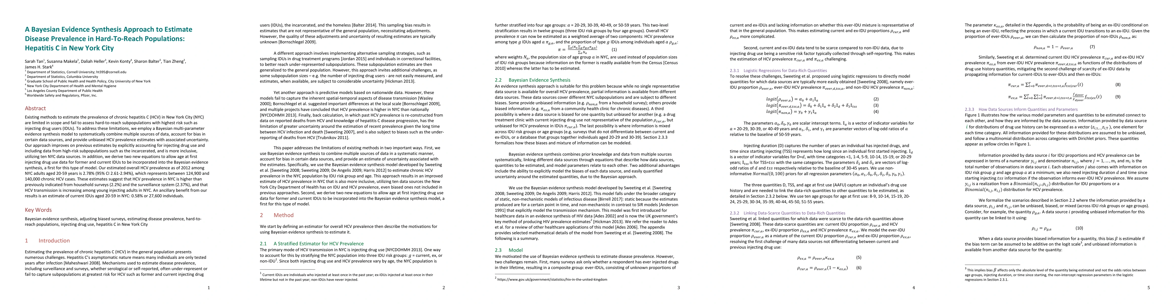 This paper employs a Bayesian evidence synthesis model to estimate the prevalence of chronic hepatitis C (HCV) in New York City, focusing on hard-to-reach populations like injecting drug users. The study provides a more accurate and inclusive estimate of 2.78% (95% CI 2.61-2.94%) for HCV prevalence among NYC adults aged 20-59, highlighting an increase in transmission among young injecting adults.
