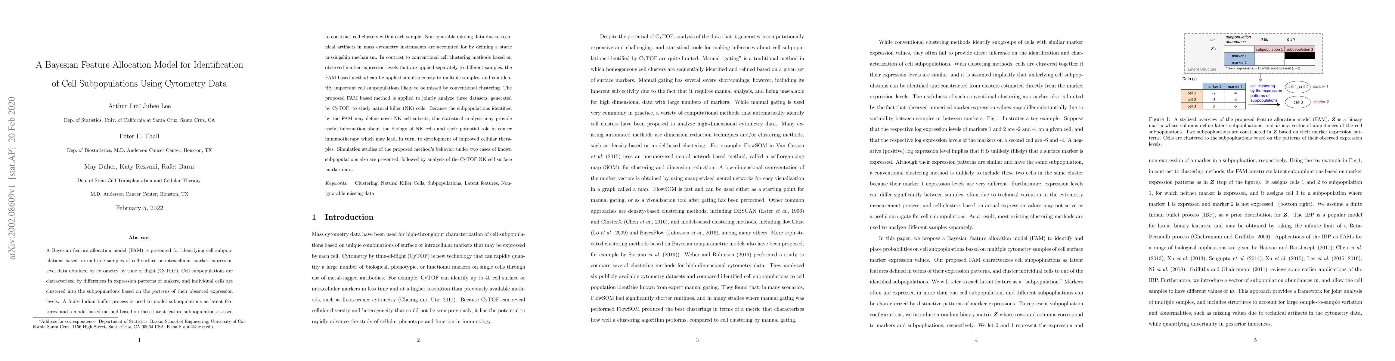 The paper presents a Bayesian feature allocation model (FAM) for identifying cell subpopulations from cytometry data, using a finite Indian buffet process to model latent features. The method can analyze multiple samples simultaneously, addressing missing data and identifying novel subpopulations, potentially enhancing cancer immunotherapy research.