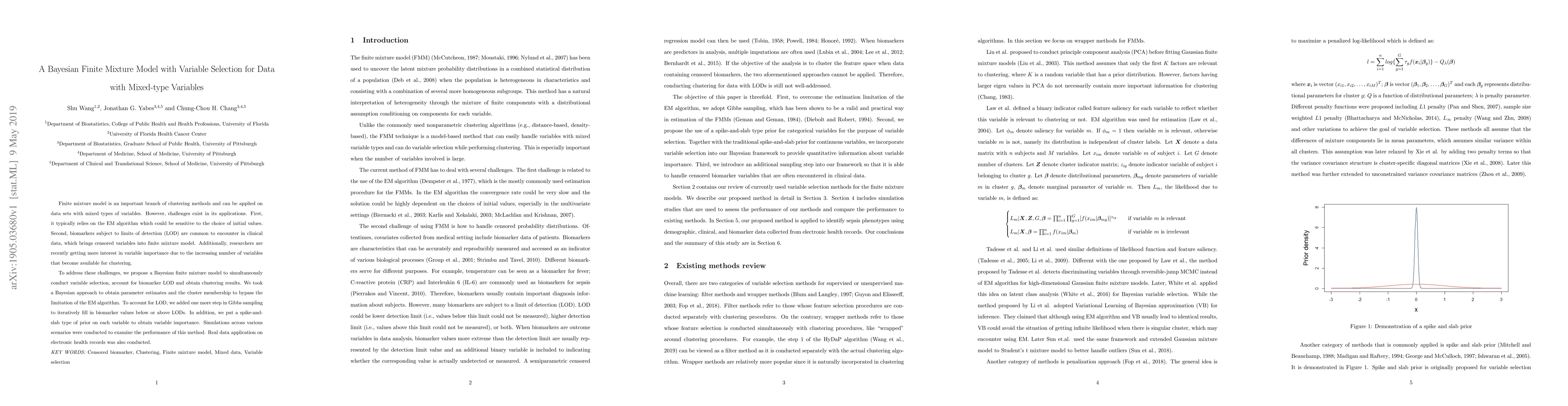 A new Bayesian finite mixture model is proposed to address challenges in clustering data with mixed types of variables, including biomarkers subject to limits of detection and variable importance.