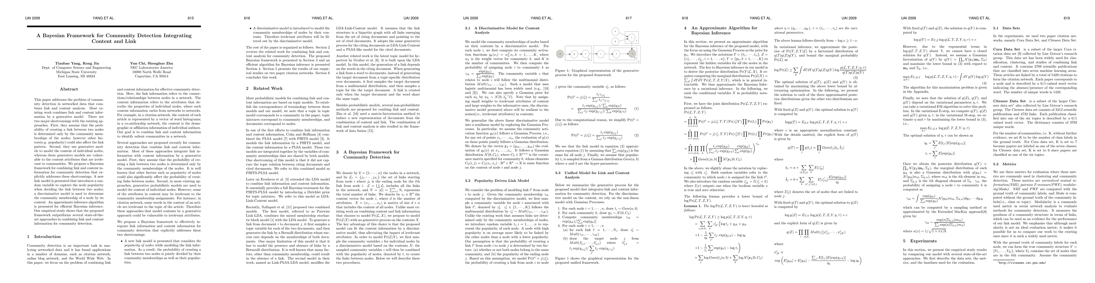 This paper proposes a Bayesian framework for community detection that integrates both link and content analysis, addressing limitations of existing generative models by incorporating node popularity and using discriminative models for content analysis. The framework outperforms state-of-the-art methods in empirical studies.