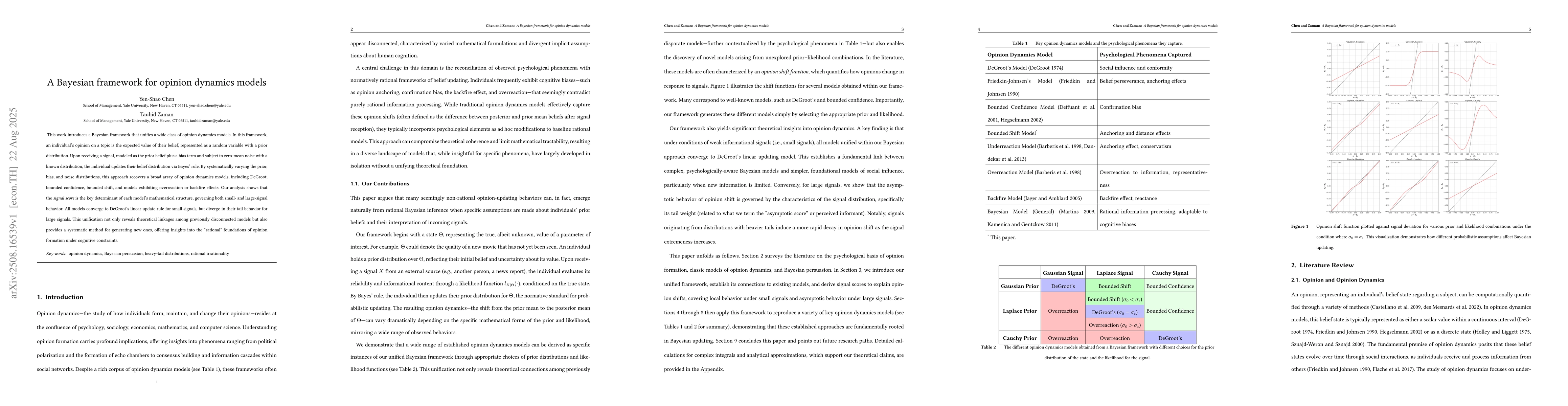 This work introduces a Bayesian framework that unifies a wide class of opinion dynamics models. In this framework, an individual's opinion on a topic is the expected value of their belief, represented as a random variable with a prior distribution. Upon receiving a signal, modeled as the prior belief plus a bias term and subject to zero-mean noise with a known distribution, the individual updates their belief distribution via Bayes' rule. By systematically varying the prior, bias, and noise distributions, this approach recovers a broad array of opinion dynamics models, including DeGroot, bounded confidence, bounded shift, and models exhibiting overreaction or backfire effects. Our analysis shows that the signal score is the key determinant of each model's mathematical structure, governing both small- and large-signal behavior. All models converge to DeGroot's linear update rule for small signals, but diverge in their tail behavior for large signals. This unification not only reveals theoretical linkages among previously disconnected models but also provides a systematic method for generating new ones, offering insights into the rational foundations of opinion formation under cognitive constraints.